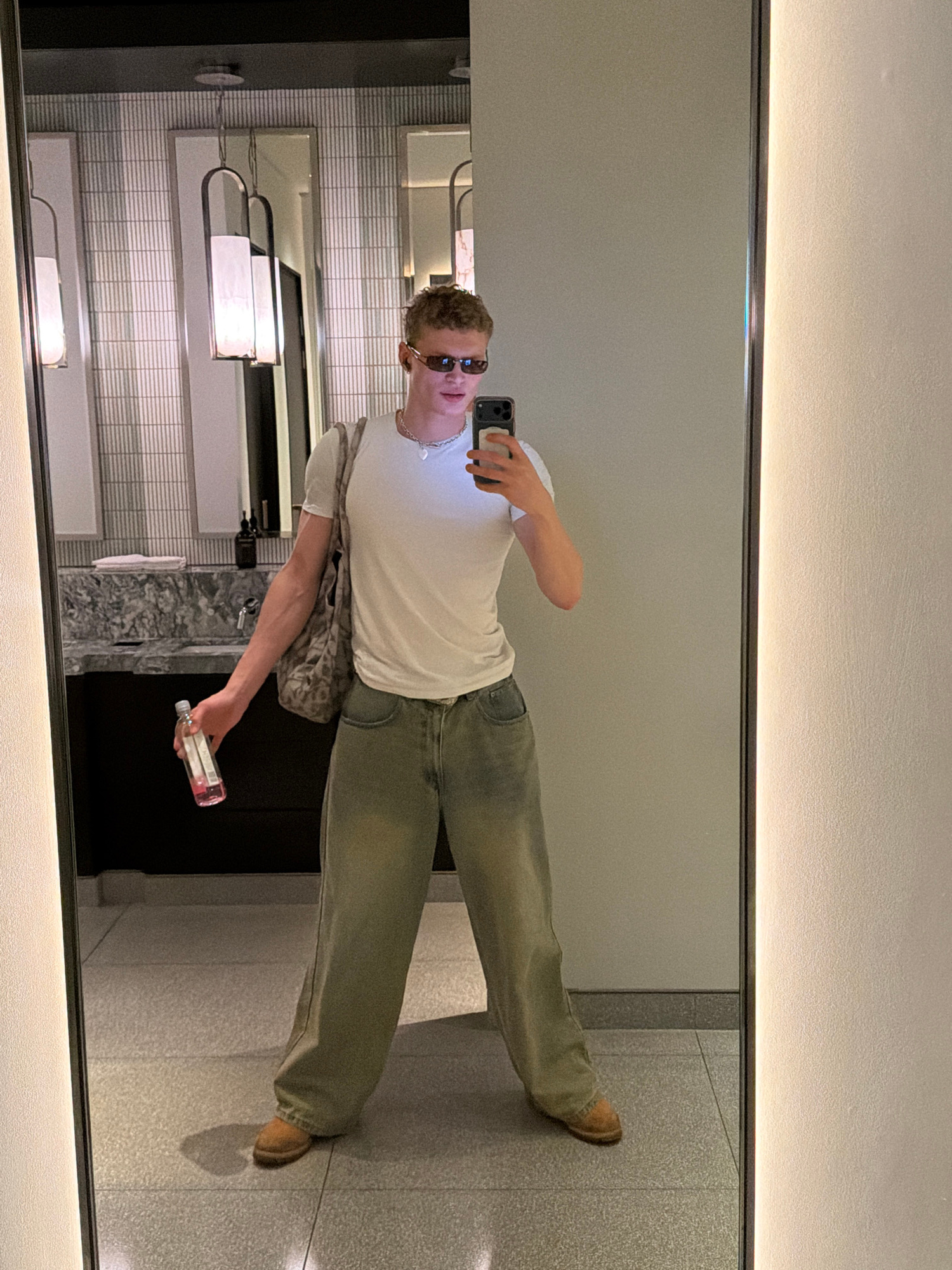 A person takes a mirror selfie in a restroom. The subject is a young male with curly hair and sunglasses. He wears a white t-shirt, loose-fitting green jeans, and brown shoes. He holds a smartphone in…read more