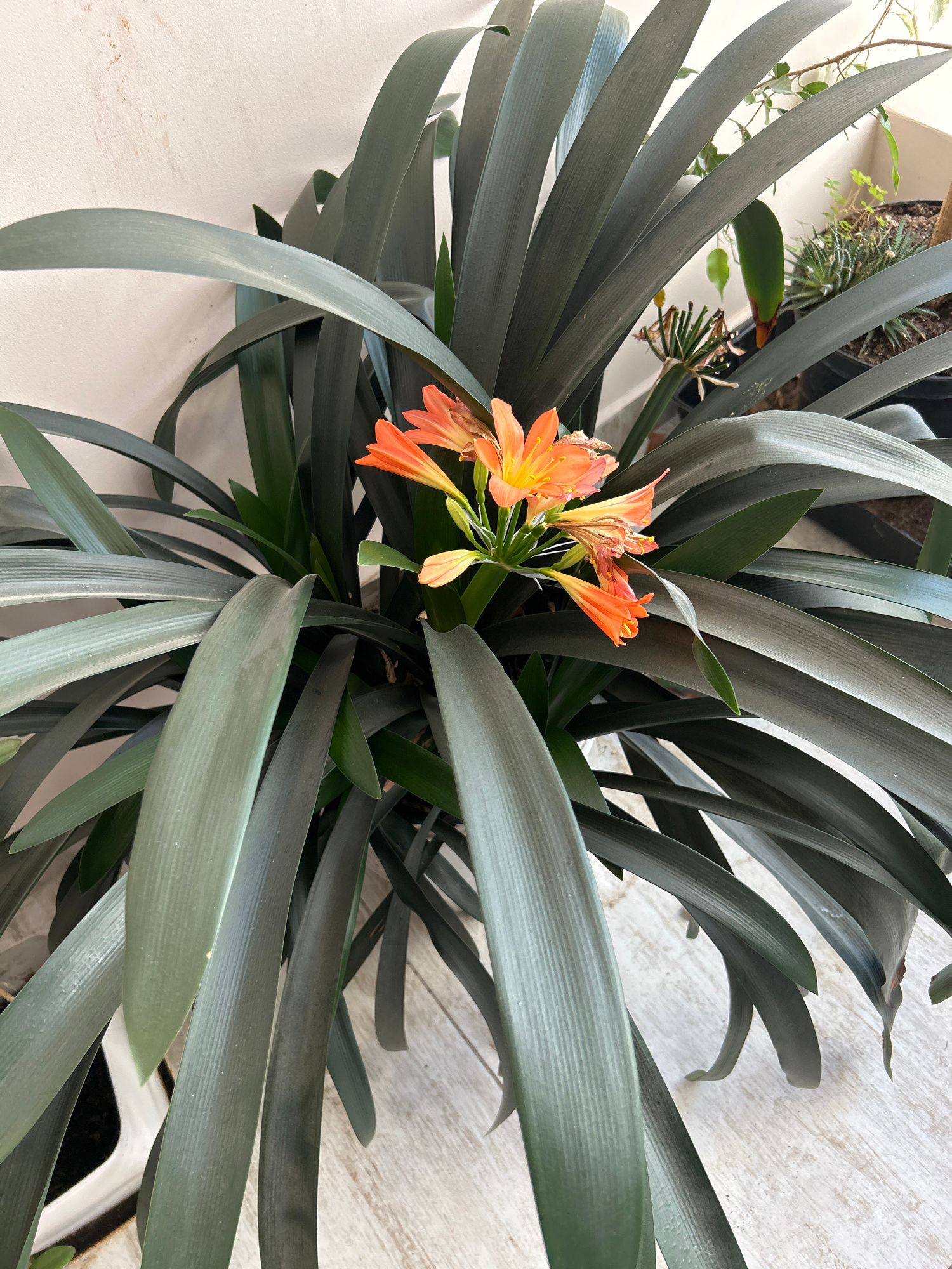 A high-angle close-up shows a potted clivia plant in bloom. The plant has numerous long, gray-green, straplike leaves that emanate from the center, creating a dense foliage. Nestled amidst the leaves…read more