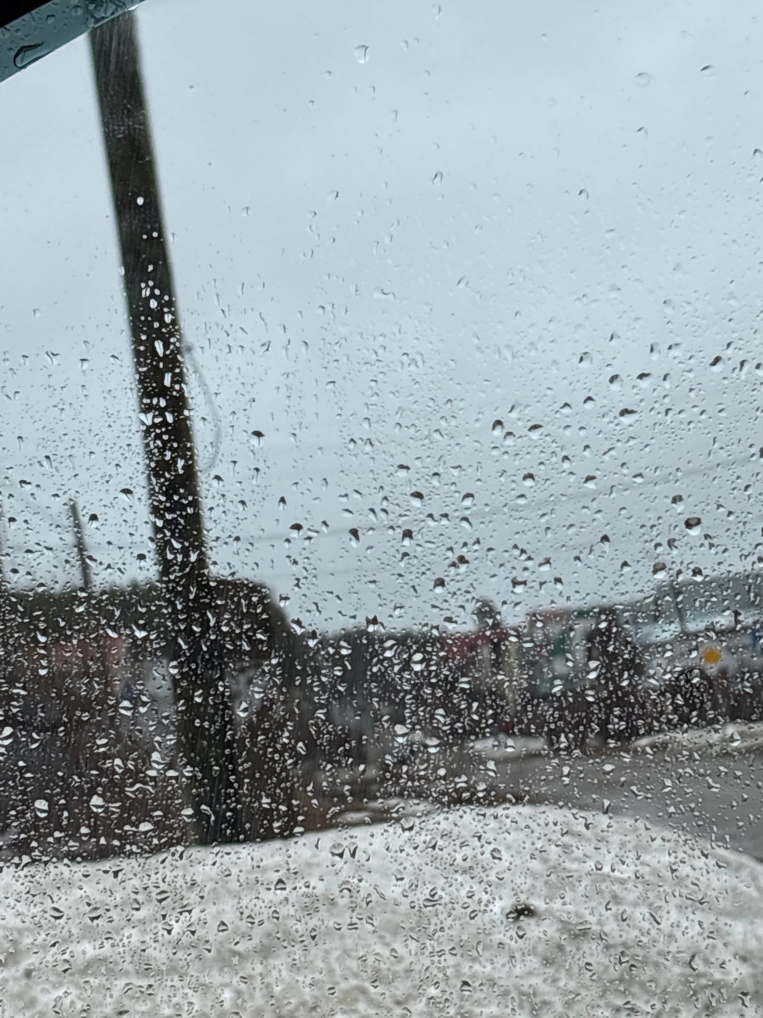 The image, taken in what appears to be rainy or snowy weather, shows a view through a wet window. Numerous water droplets or snowflakes are visible on the glass surface, partially obscuring the scene…read more