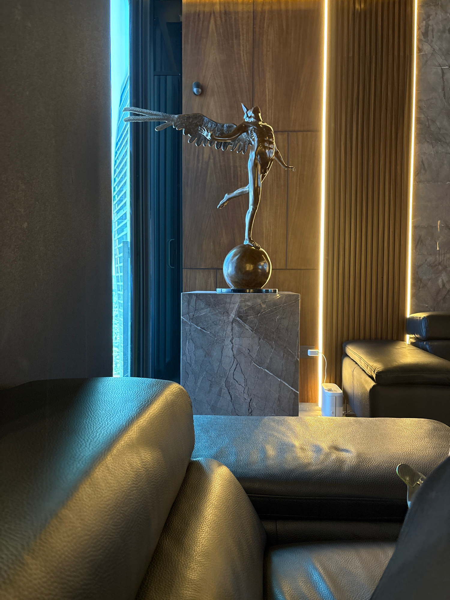 The image shows an interior setting. A bronze sculpture of a bird-like figure with outstretched wings is placed on a marble-topped surface. The surface sits next to a dark leather chair or sofa. The b…read more