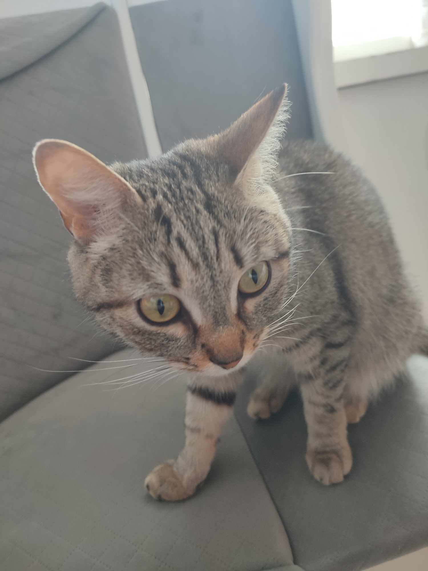 A tabby cat is perched on a gray cushioned surface. The cat has green eyes and white whiskers. The background includes a window and part of a gray couch. There is no indication of the city of Chaikovs…read more