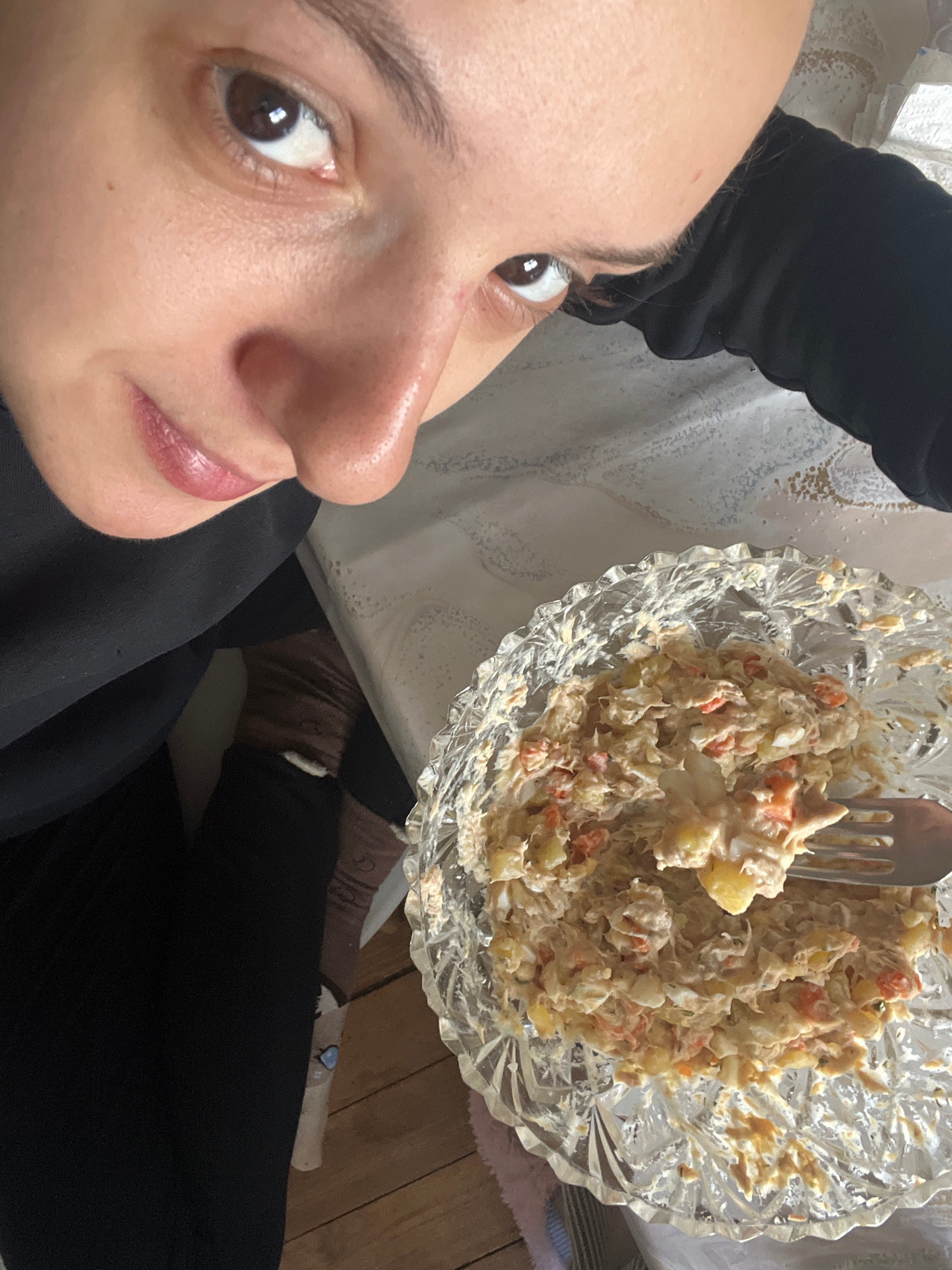 A woman is taking a selfie while holding a crystal bowl of salad with a fork in it. She is wearing black clothing and socks. The table is covered with a white and blue tablecloth. The floor is made of…read more