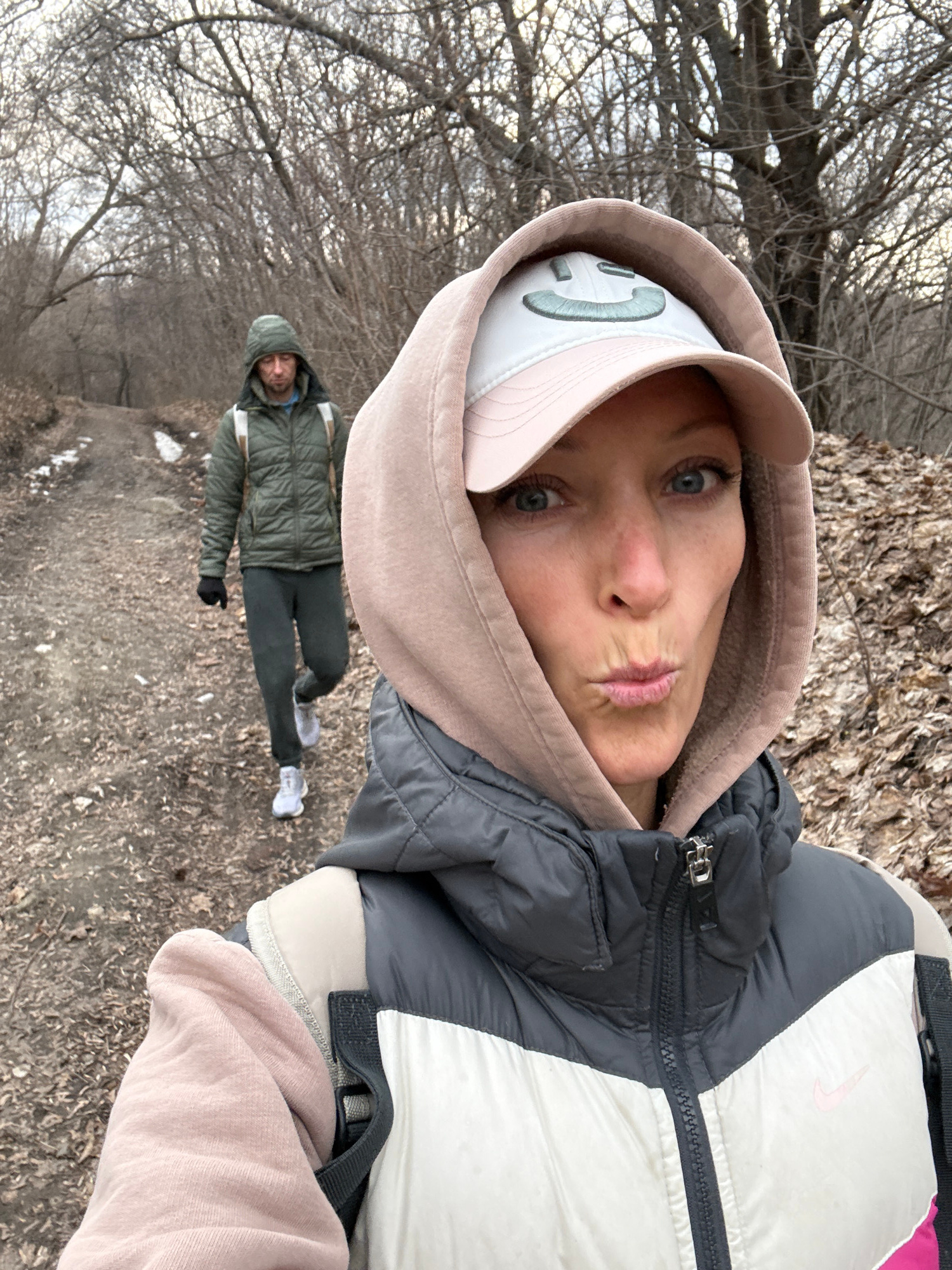 The image shows a selfie of a woman with blue eyes and a slight pout. She is wearing a white and grey Nike jacket with a pink hooded sweatshirt underneath and a white visor with a green design. Behind…read more