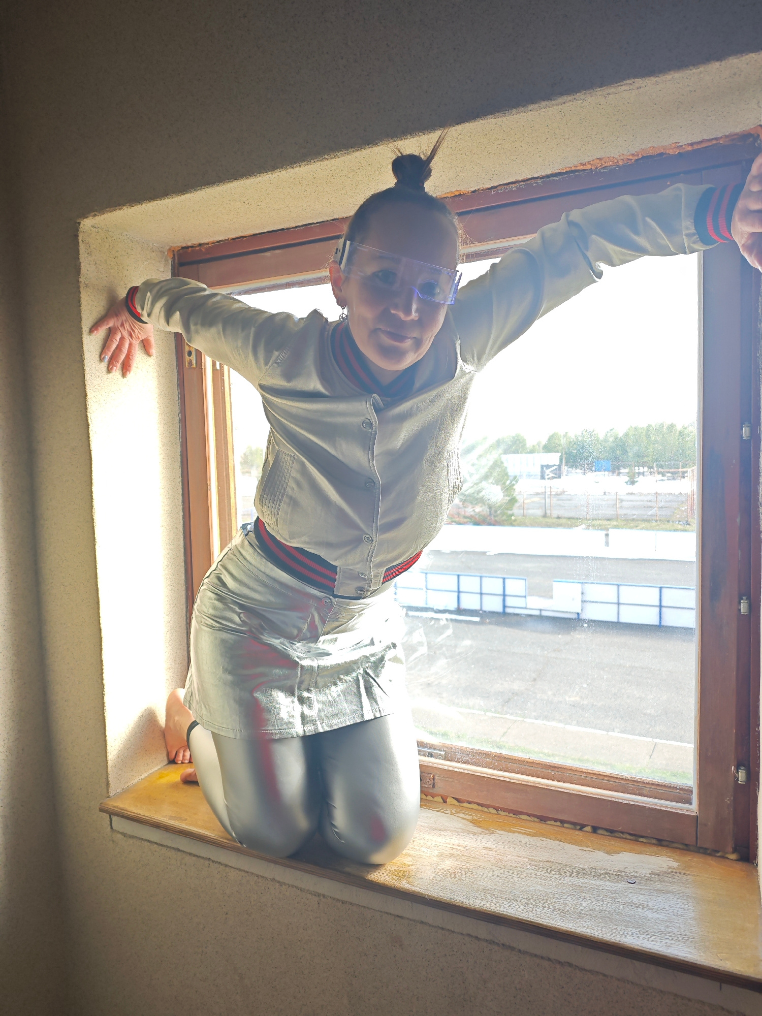 A woman in a silver outfit and clear safety glasses is crouched in a window frame. She is wearing a silver bomber jacket with a red and black striped collar and cuffs, a matching silver skirt, and sil…read more