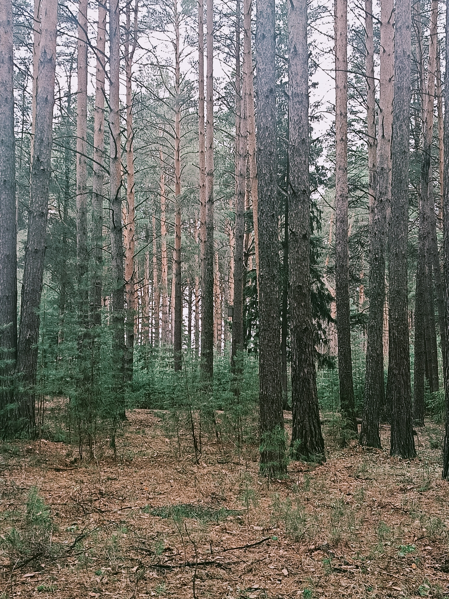 The image shows a dense pine forest located in Chaikovsky, Russia. The forest floor is covered with brown pine needles and small green shrubs. Numerous tall, straight pine trees dominate the scene, th…read more