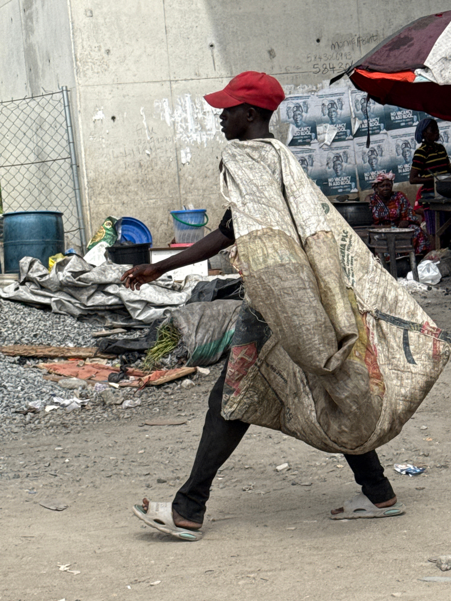 An individual wearing a red cap, dark pants, and sandals stands on a paved surface next to a pile of trash, with an over-the-shoulder covering made from a large sack or bag. The setting appears to be…read more
