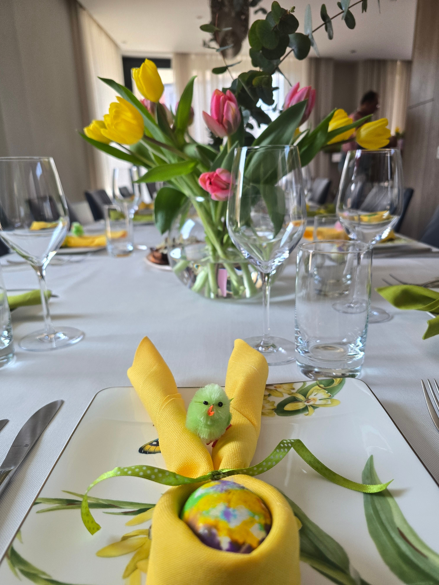 A decorated table set for a meal is displayed. A centerpiece of pink and yellow tulips and eucalyptus leaves in a glass vase is aligned with a row of stemmed glasses and clear tumblers. Each plate is…read more