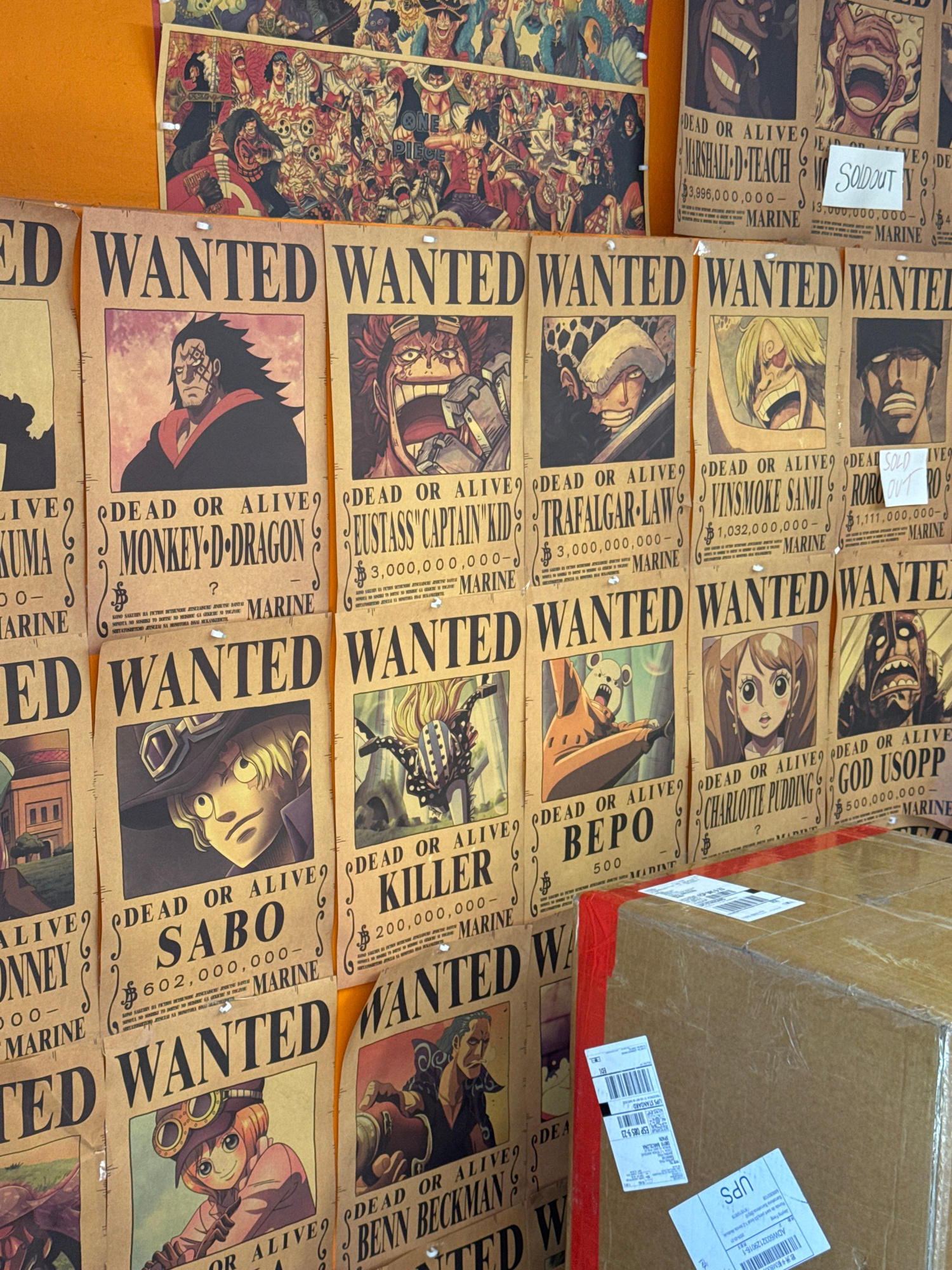 The image shows a collection of One Piece wanted posters laid out on a surface. The posters depict various characters from the series with their names and bounty amounts. A cardboard box with a UPS sh…read more