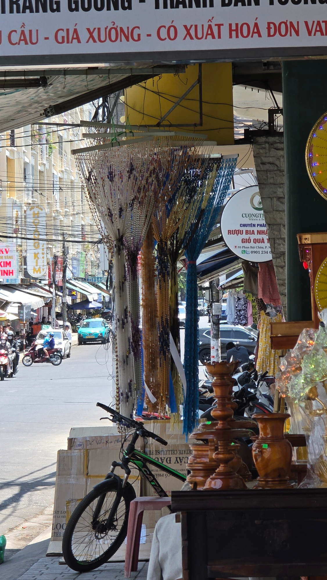 The image is a street-level view in Nha Trang, Vietnam. The scene is captured from a partially covered area, possibly a shop or storefront, with beaded curtains hanging overhead, creating a tunnel eff…read more