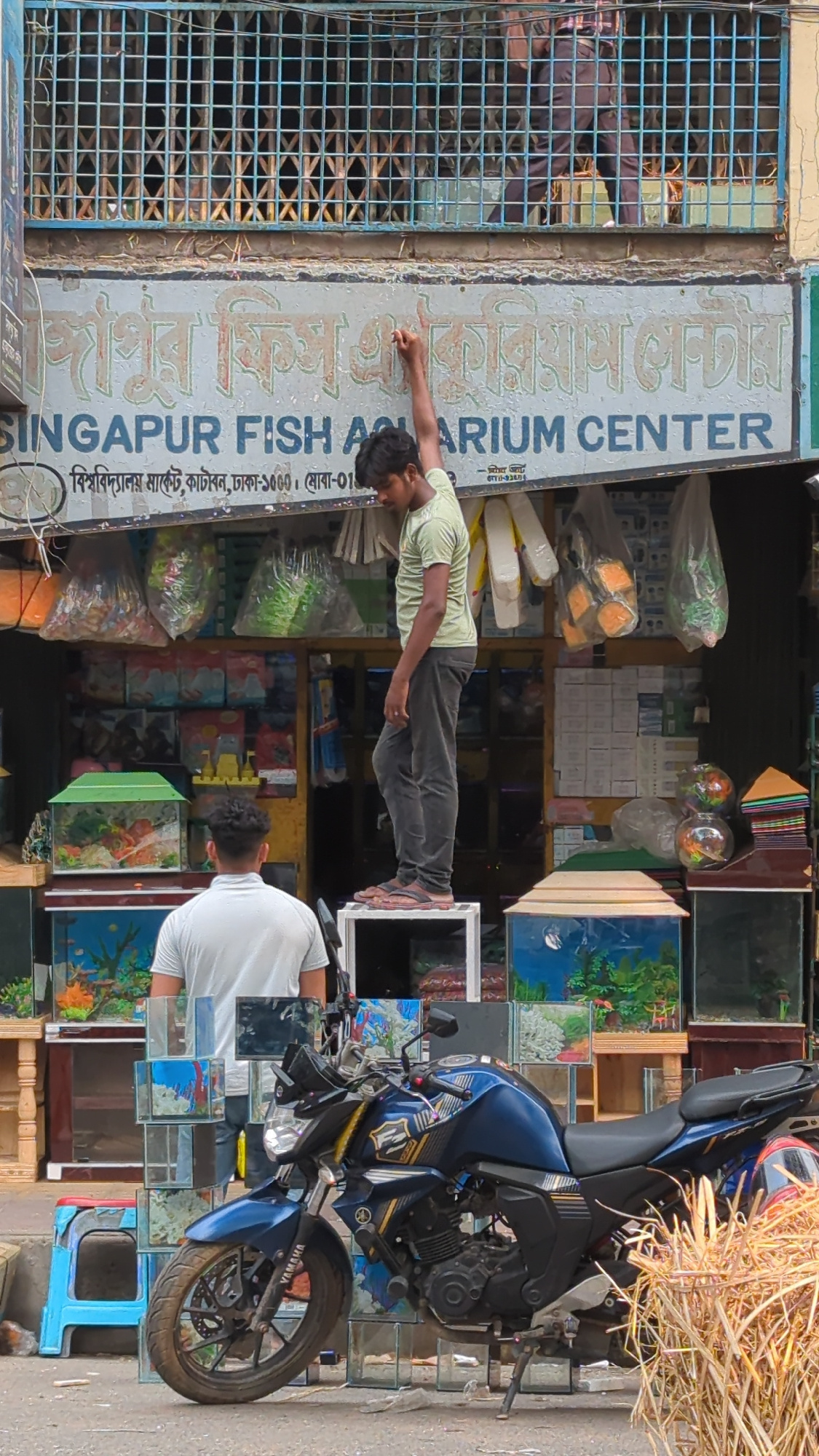 The image shows the front of the "Singapur Fish Aquarium Center" in Dhaka, Bangladesh. A man in a light green shirt and dark pants is standing in front of the shop, pointing at the sign. Another man w…read more