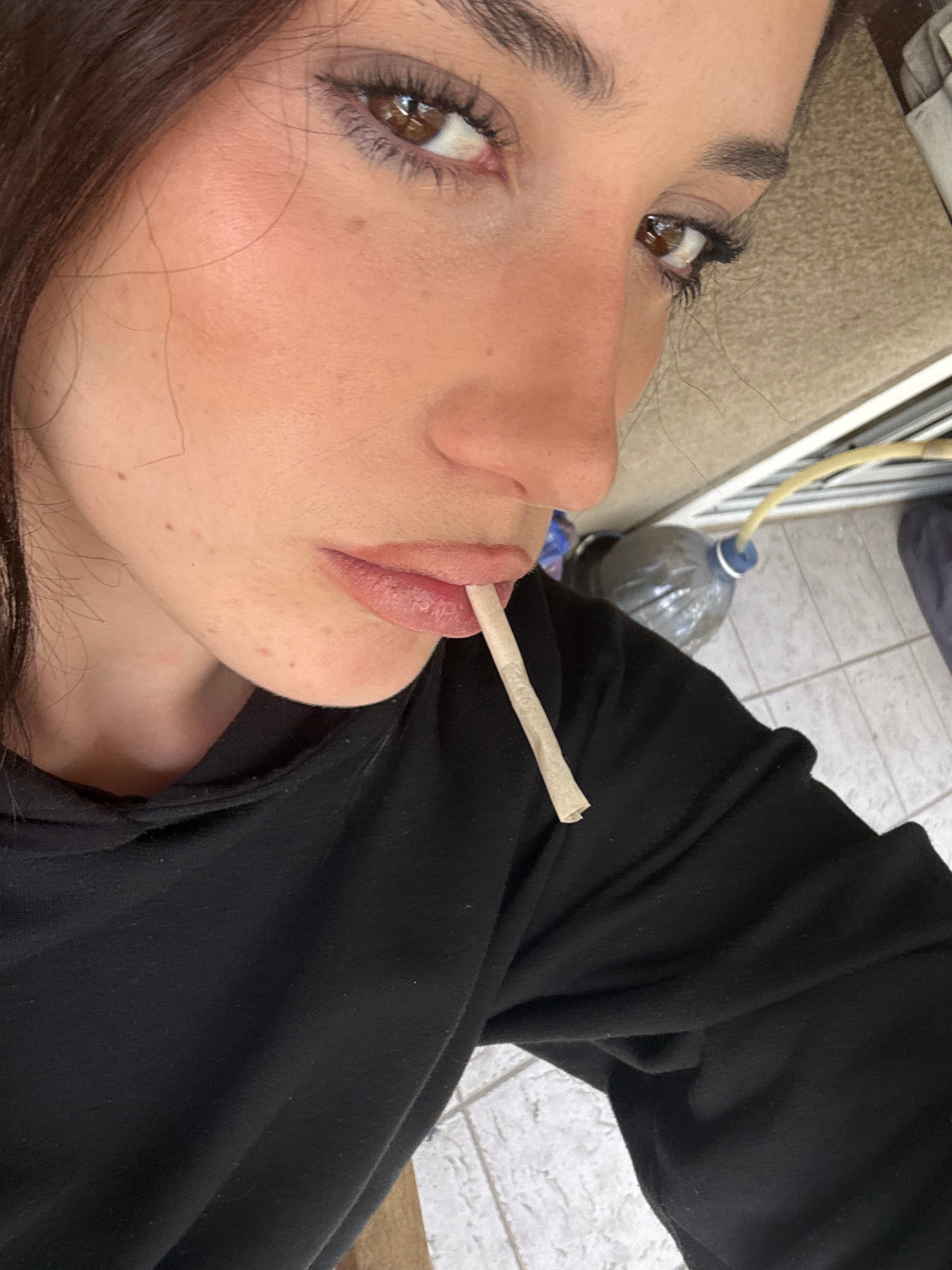 A close-up, angled shot features a woman with brown eyes and dark hair, holding a rolled cigarette in her mouth. She is wearing a black sweatshirt. Behind her and to the side is a plastic bottle conne…read more