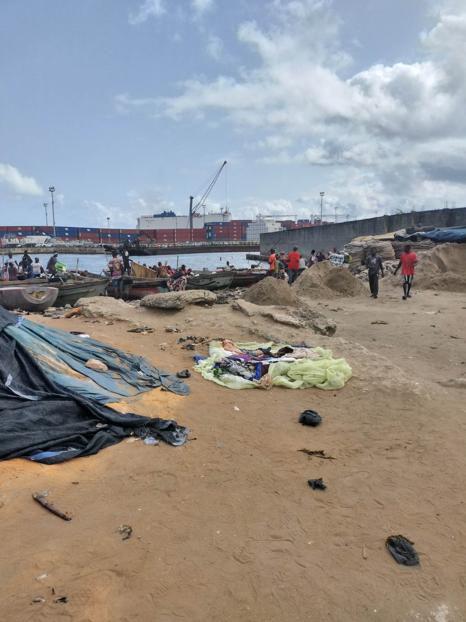 This full-shot image depicts a busy, informal waterfront scene in Alaiyabiagba, Nigeria, under a partly cloudy sky during daytime. The foreground is sandy ground littered with a large dark blue/black…read more