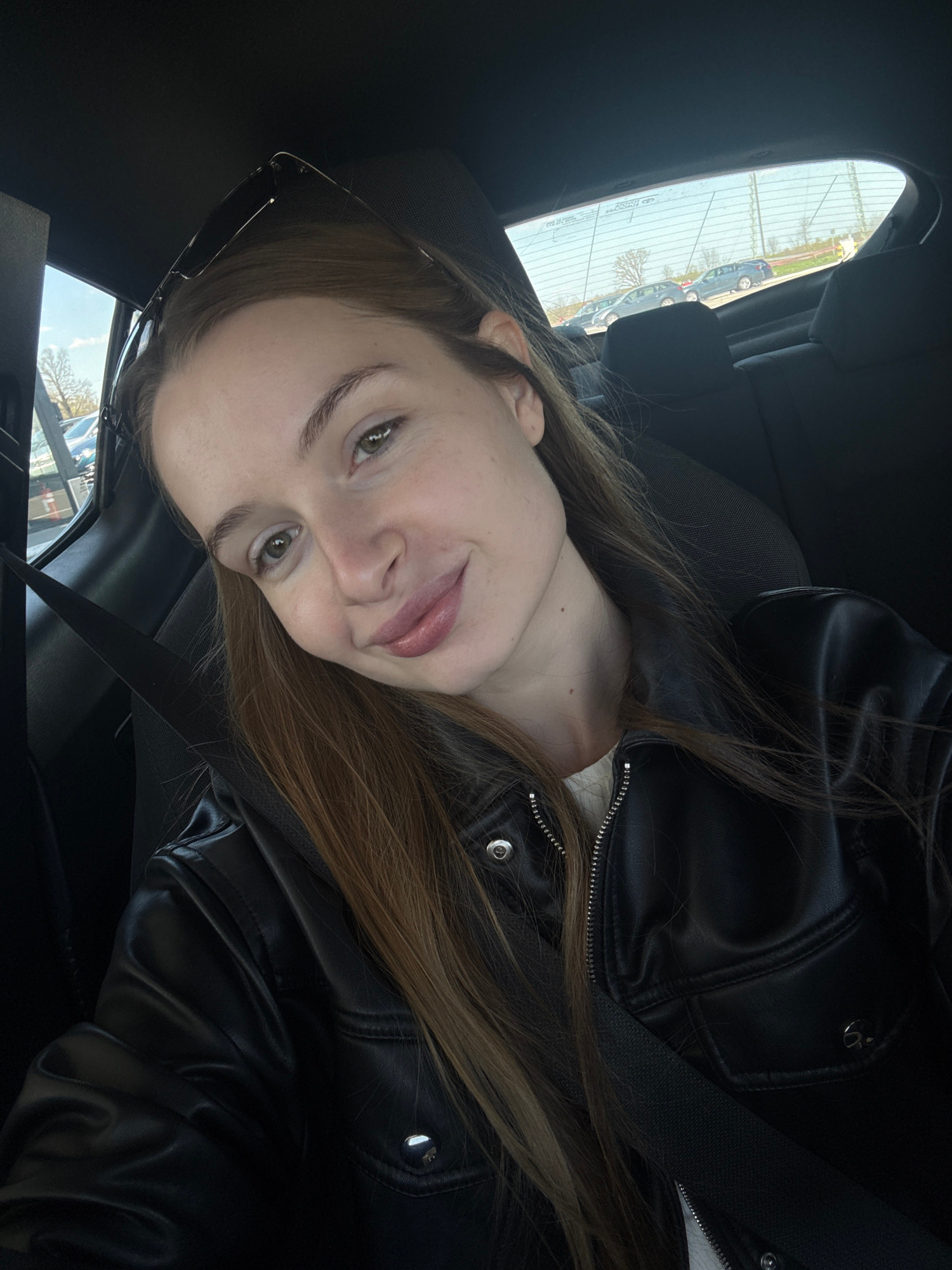 A woman is seated in a car, wearing a black leather jacket and a seatbelt. She has long brown hair, light skin, and is looking towards the camera. Sunglasses are perched on her head. The scene suggest…read more