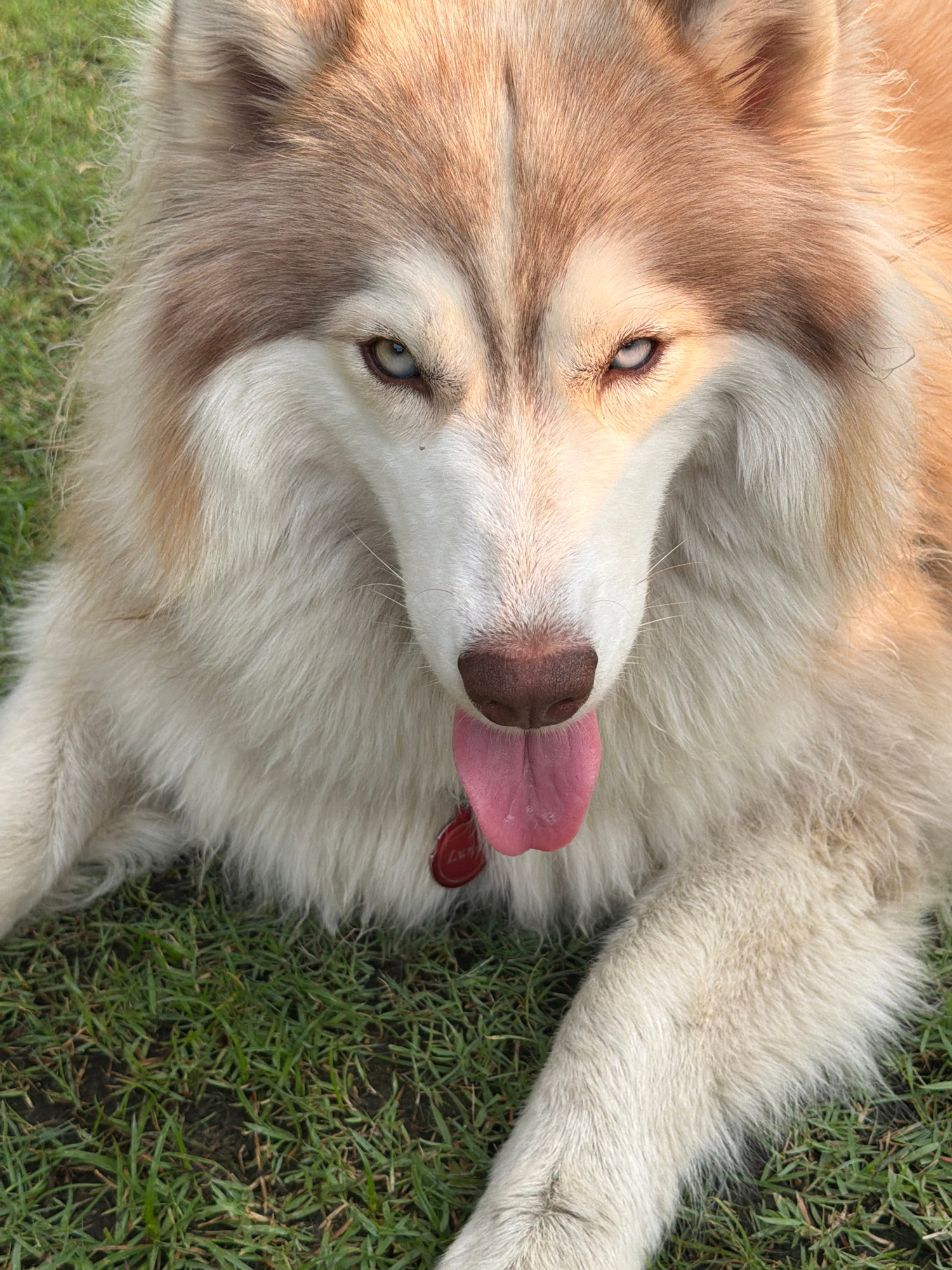 A dog, possibly a husky or a husky mix, lies on its side on a patch of green grass, with its tongue lolling out. The dog has brown and cream-colored fur. The grass appears to be artificial and is not…read more