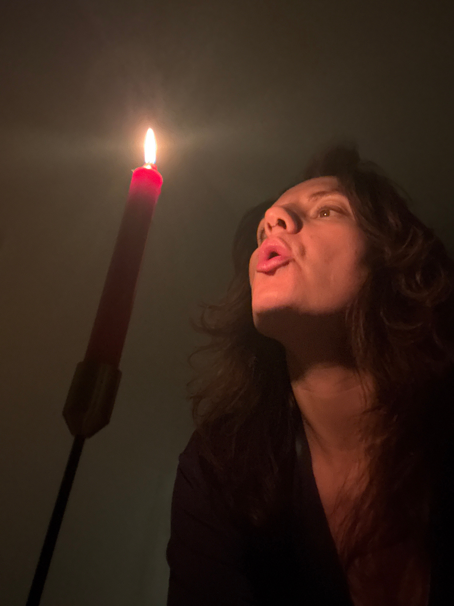 A woman with dark, curly hair is positioned at the top of the frame, her face illuminated by the light of a red candle with a bright flame. Her lips are pursed as if she is about to blow out the candl…read more