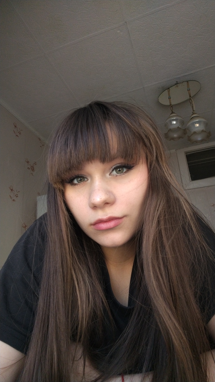 A close-up portrait shot features a young person, likely female, from the forehead to the chin, with a portion of dark brown hair visible on the right side. The person is looking directly at the camer…read more