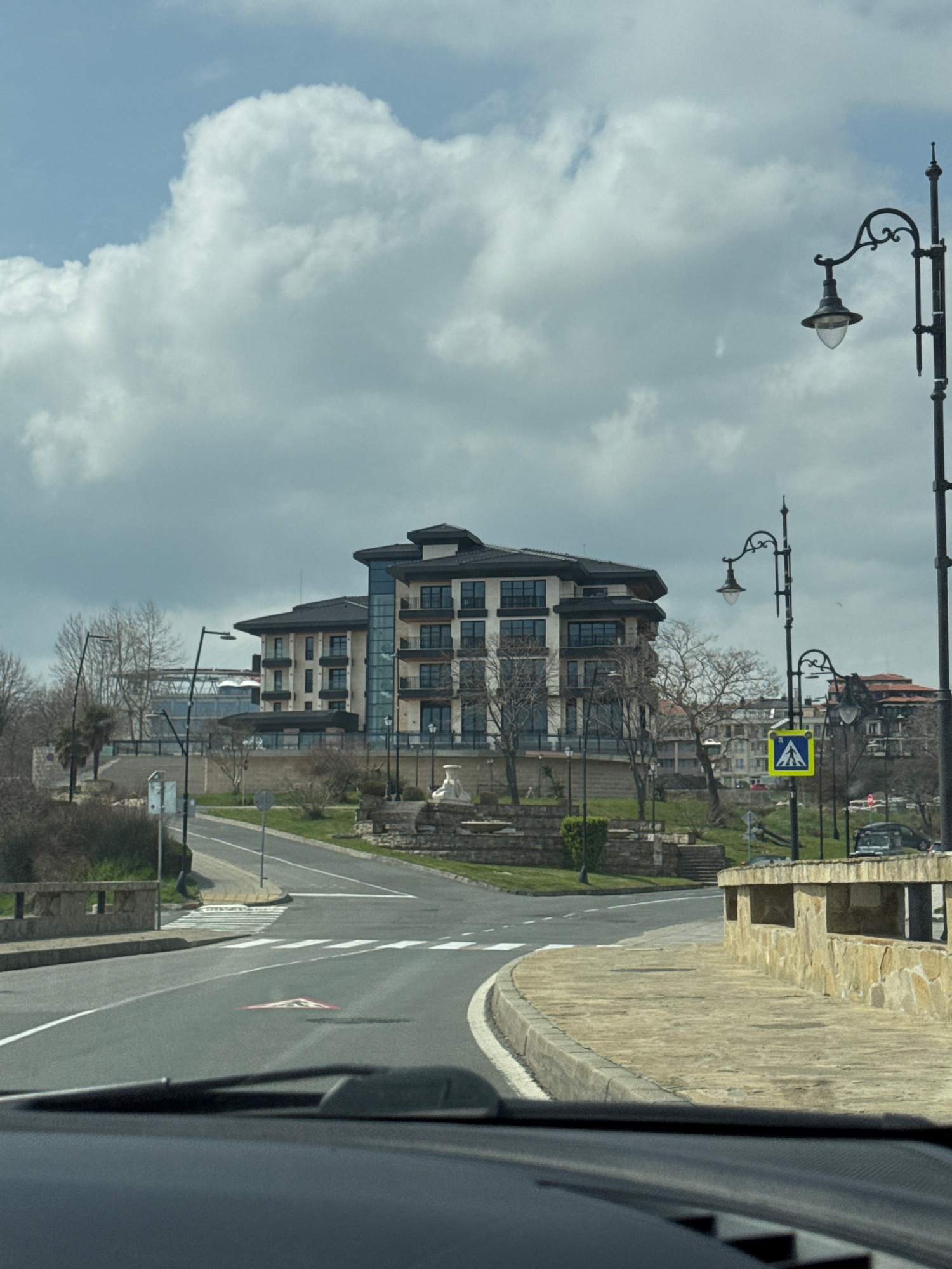 The image, likely taken from inside a vehicle, shows a street scene in Nesebar, Bulgaria. The focus is on a multi-story building with a modern architectural style, featuring multiple windows and balco…read more