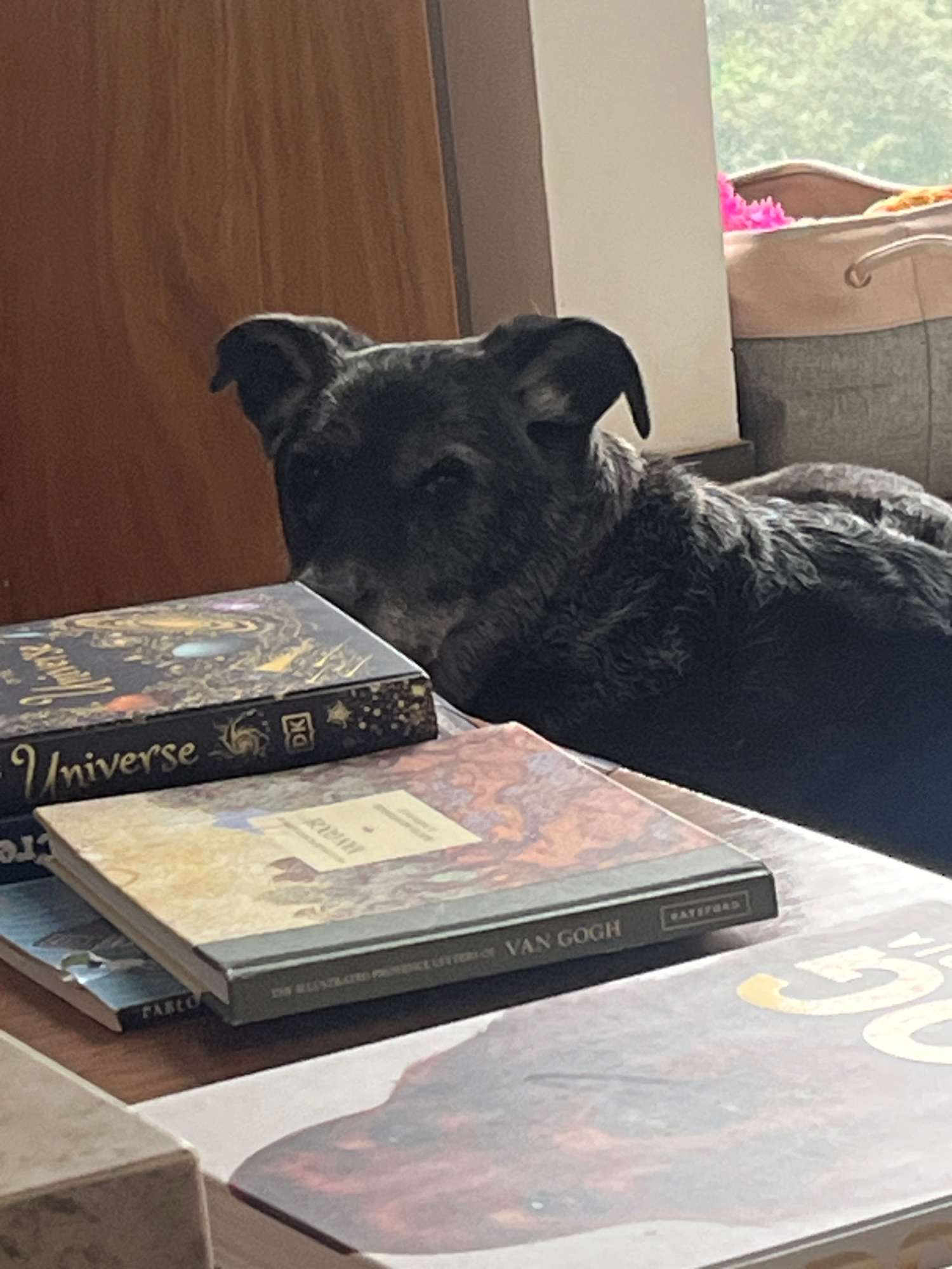 A gray dog rests its head on a stack of books. The books are "Universe" by DK, "Byron," and "Van Gogh" by Taschen. The dog is lying near a window with a partial view of foliage. There is a tote bag in…read more