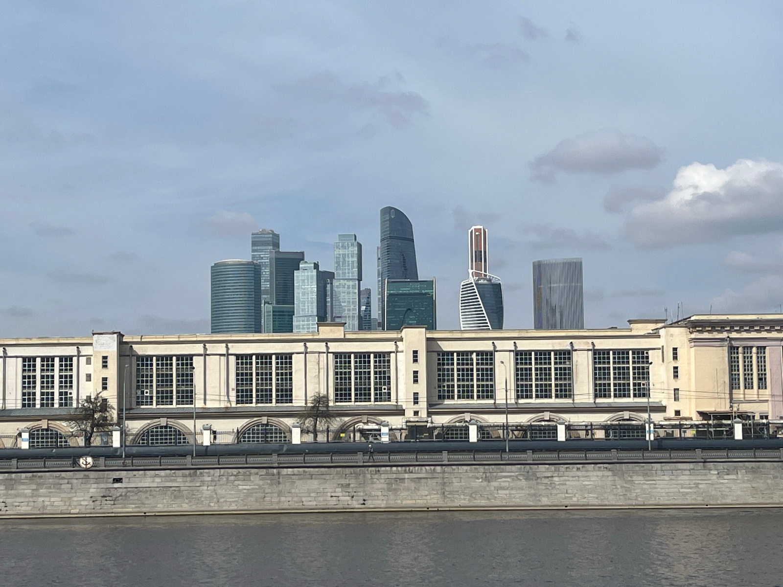 The image shows a cityscape scene in Moscow, Russia, featuring a large, beige building in the foreground and several modern skyscrapers in the background. The building has a symmetrical design with nu…read more