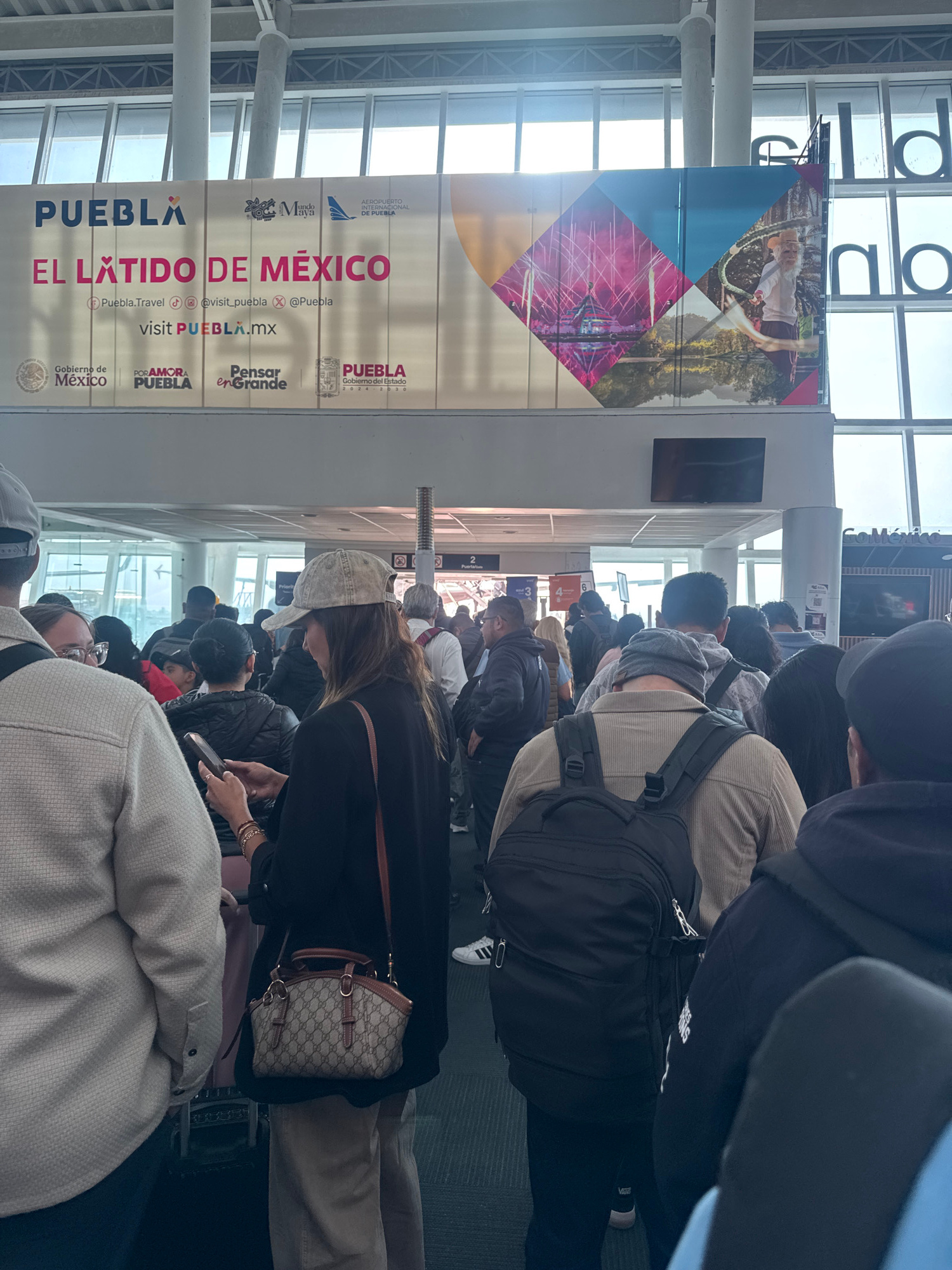 This image captures a bustling scene inside an airport terminal, likely the Puebla International Airport in Huejotzingo, Mexico. A long queue of people, mostly viewed from behind, extends into the dis…read more