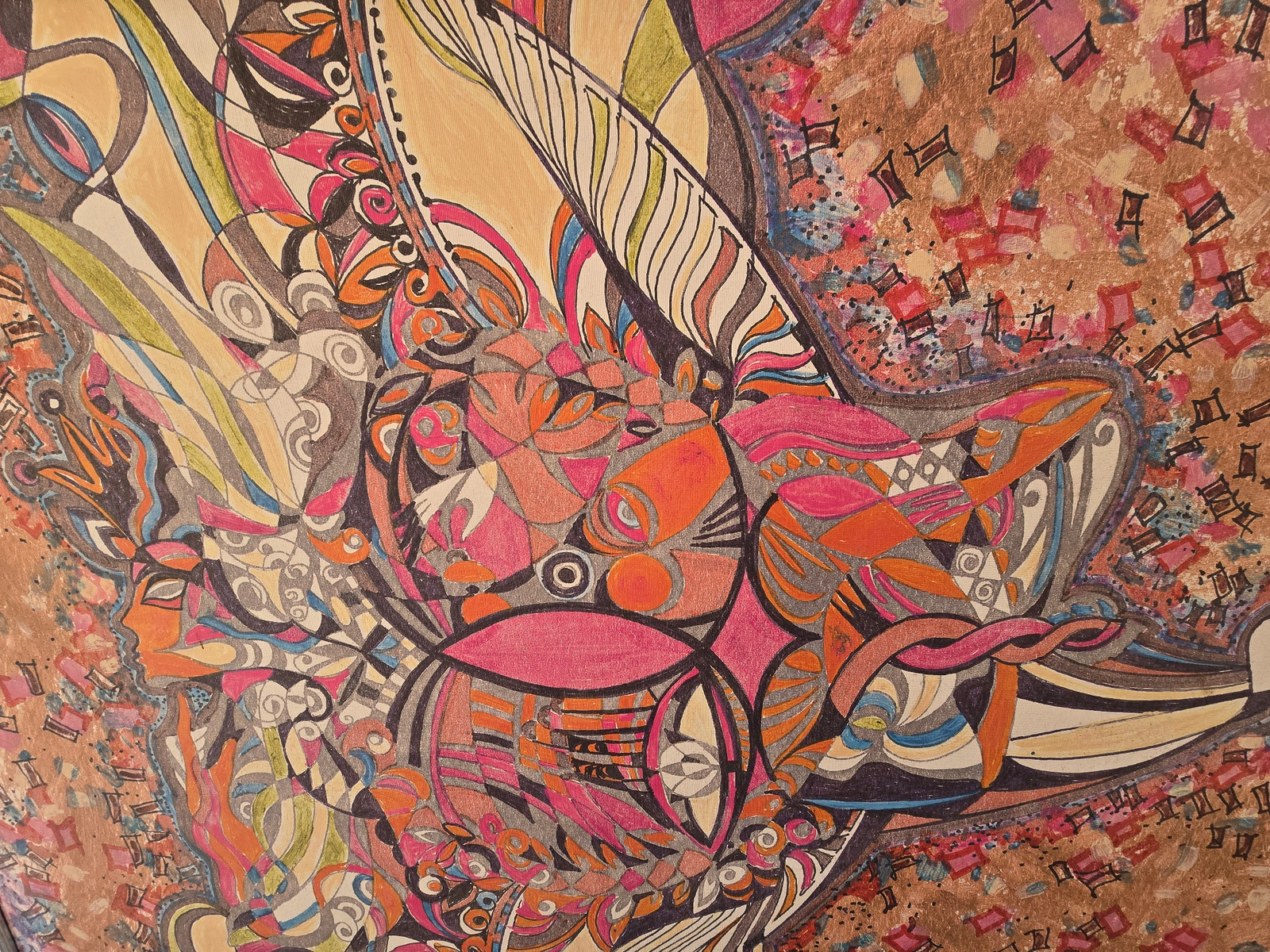 The image is an abstract, colorful drawing or painting. It features a complex arrangement of shapes, lines, and patterns in shades of orange, pink, brown, black, blue, and cream. There are elements th…read more