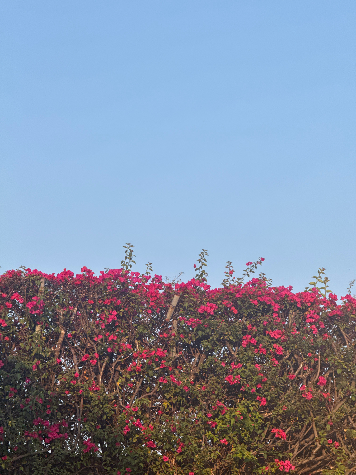 The image displays a dense hedge of blooming Bougainvillea, characterized by numerous vibrant magenta-pink floral bracts interspersed among dark green leaves and a network of brown, woody stems. This…read more