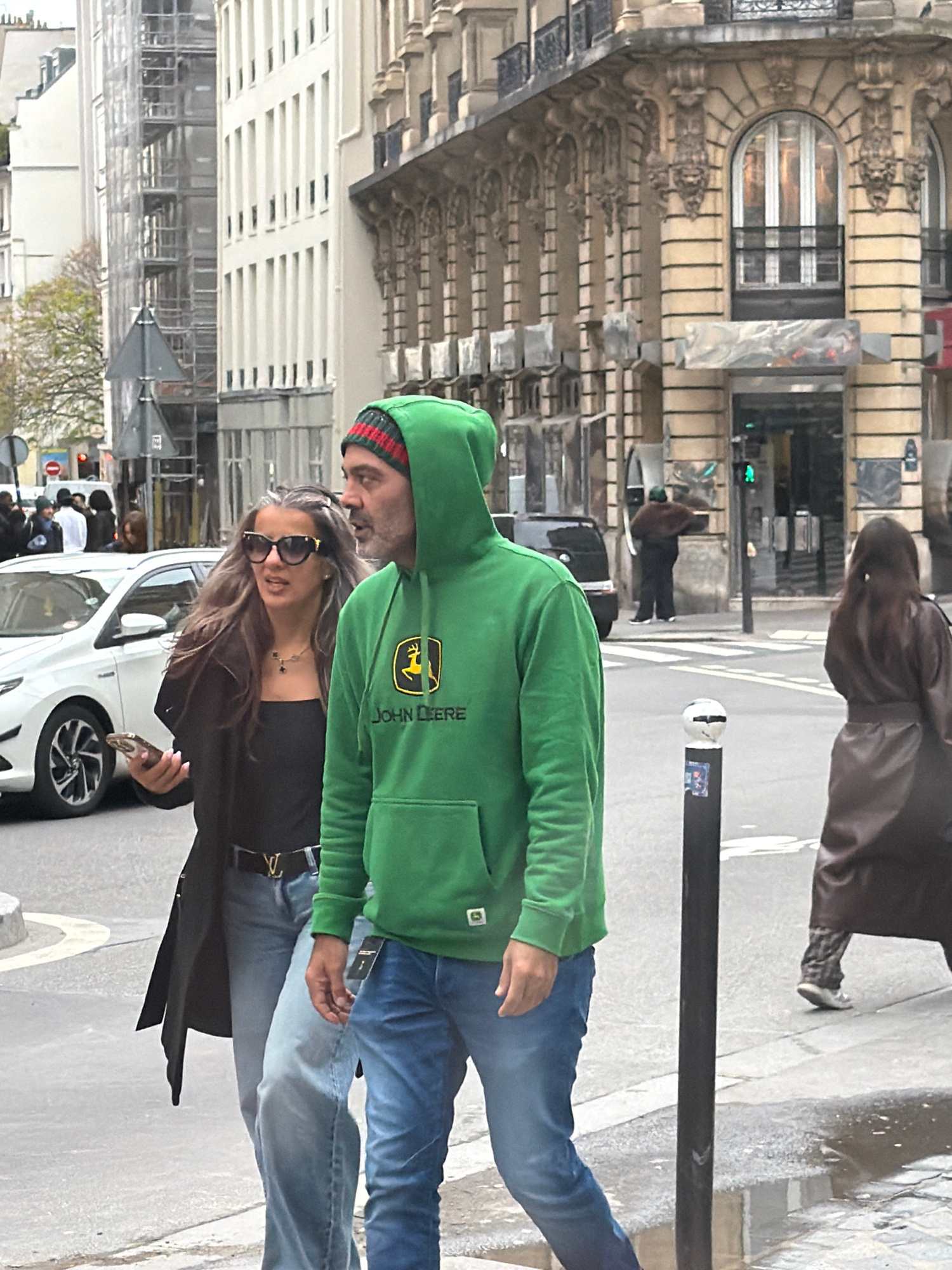 The image depicts a street scene in Paris, France. A couple walks along the sidewalk. The man wears a green John Deere hoodie and blue jeans, and a multi-colored beanie. The woman wears a black top, a…read more