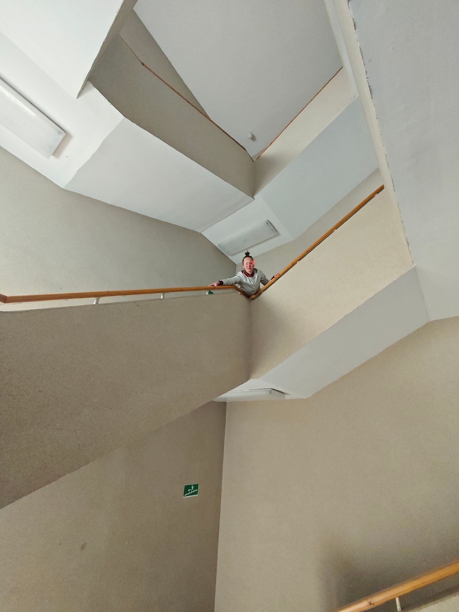 A medium shot captures a person on the landing of a stairwell. The person is fair-skinned with their hair styled up, wearing a light gray zip-up jacket. The person's left arm is visible over the woode…read more