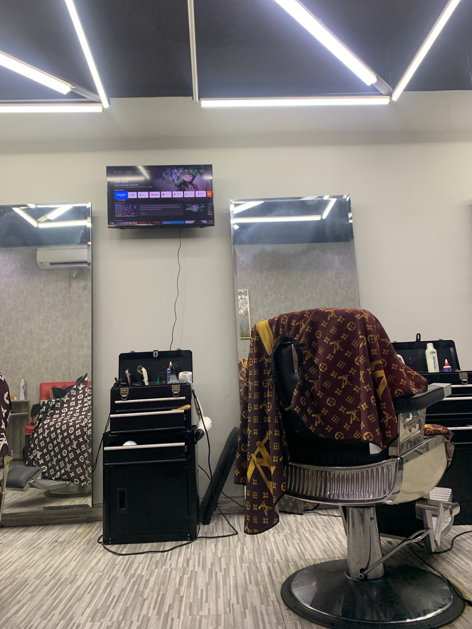 The image displays the interior of a modern barbershop or salon, characterized by a clean and contemporary design. The setting features light grey/white walls, with a distinctive black accent wall on…read more