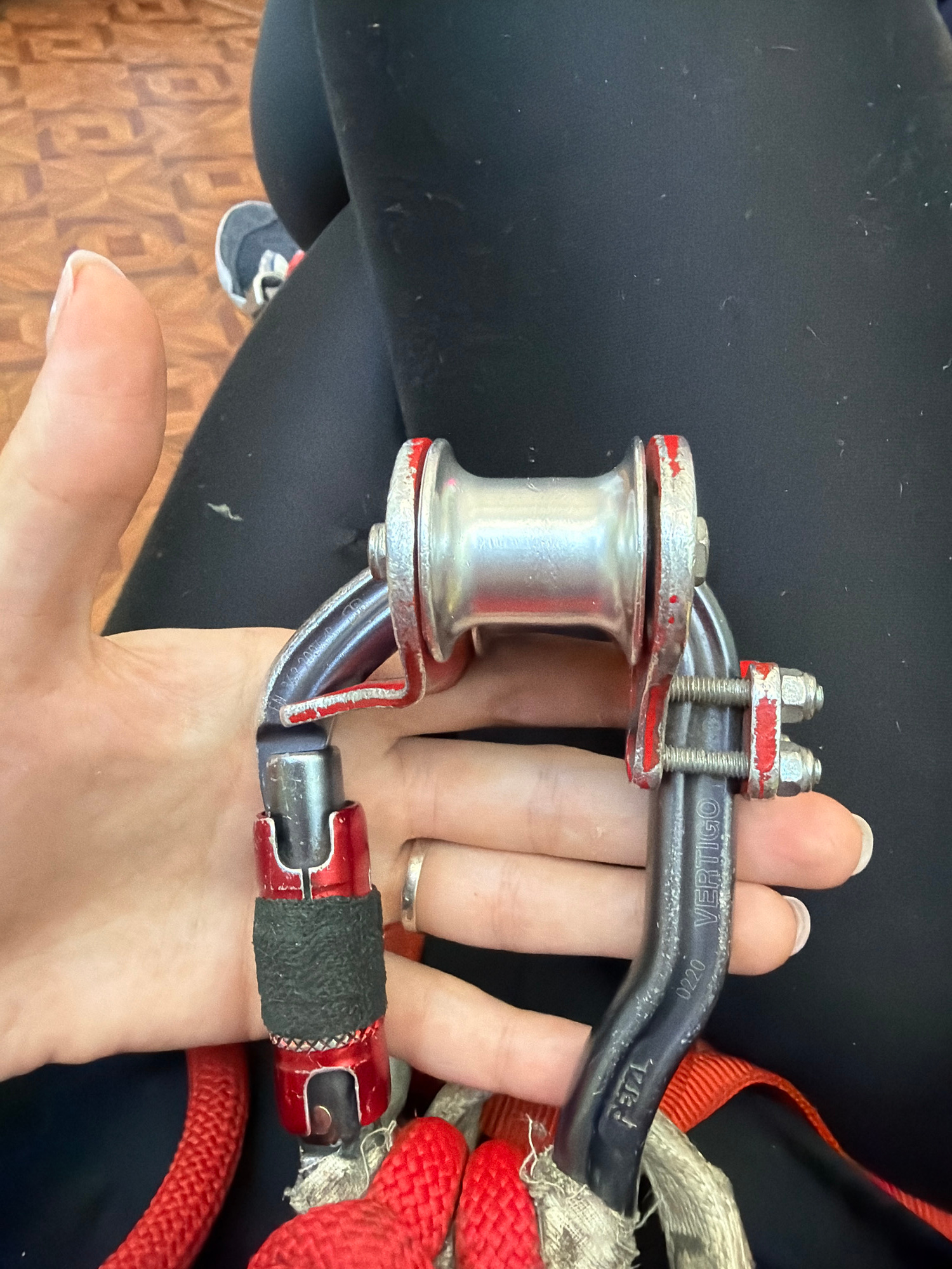 A person holds a Petzl Vertigo climbing pulley in their left hand. The pulley is made of silver metal, with red and black accents. The rope attached to the pulley is red and white. The person's hand iā¦read more