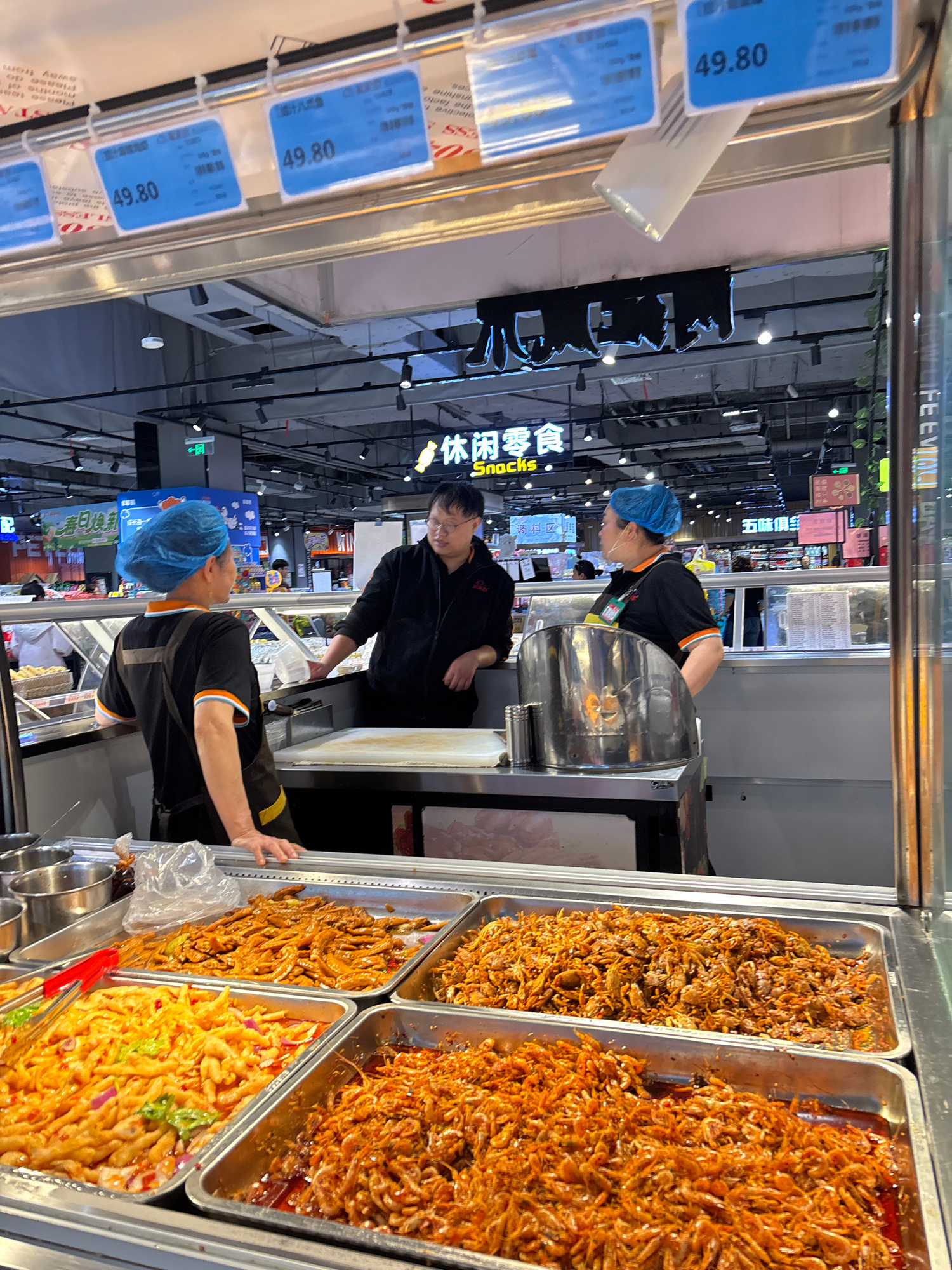 Here is a detailed description of the image: **Scene:** The image depicts a food stall within a supermarket or large market environment, likely in Jiangjin, China. This is inferred from Chinese chara…read more