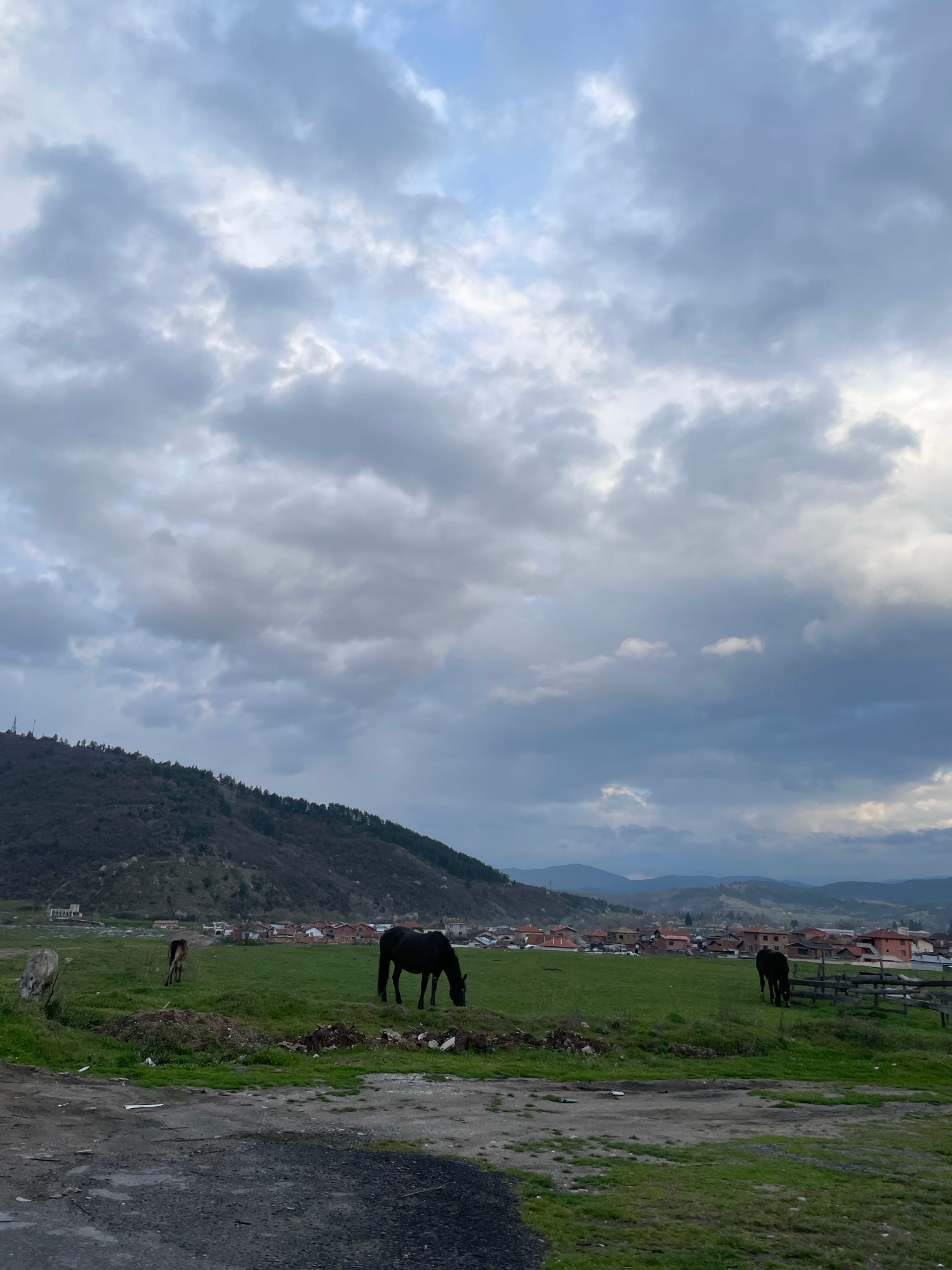 The image depicts a rural landscape in Velingrad, Bulgaria, featuring a grassy field under a cloudy sky. Several dark-colored horses graze in the field. A nearby hillside is dotted with vegetation and…read more