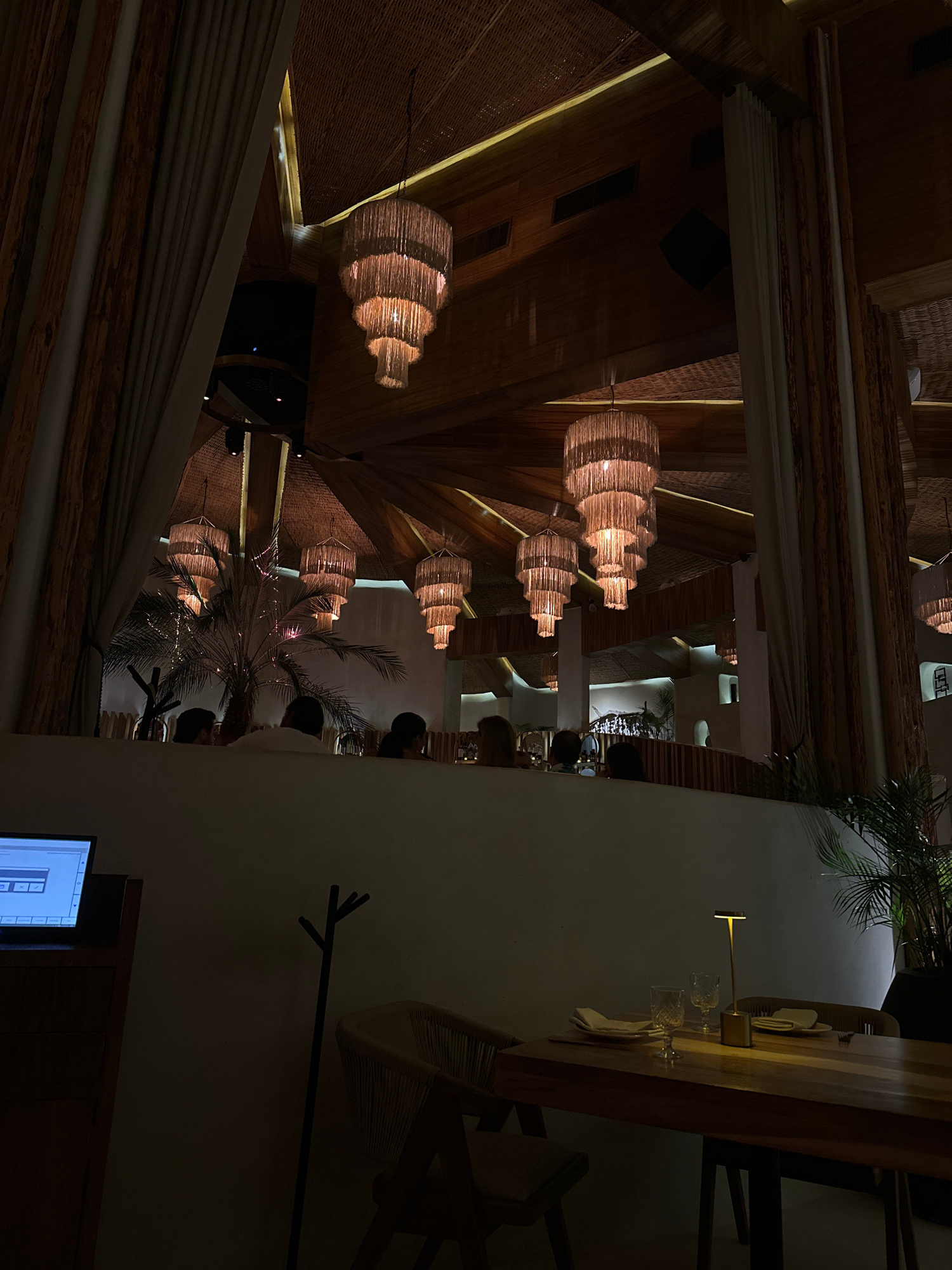 The image captures a dimly lit interior, likely a restaurant or lounge, characterized by a tropical aesthetic. The location is assumed to be in Acapulco, Mexico. The space features a high, angled that…read more