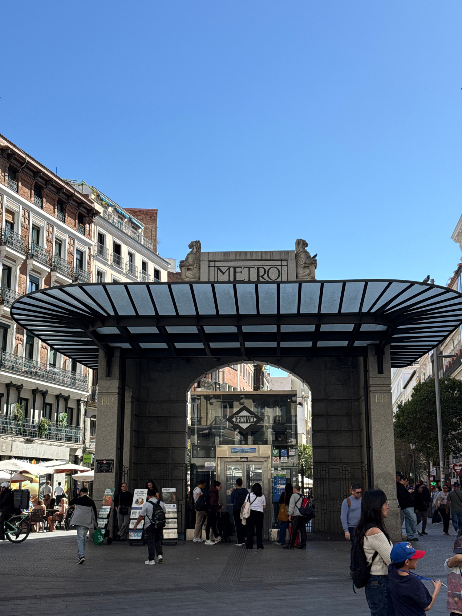 This image shows the Metro entrance at Gran Via in Madrid, Spain. The Metro entrance features a stone structure with the word "METRO" inscribed vertically. The Metro symbol is on top and two sculpture…read more
