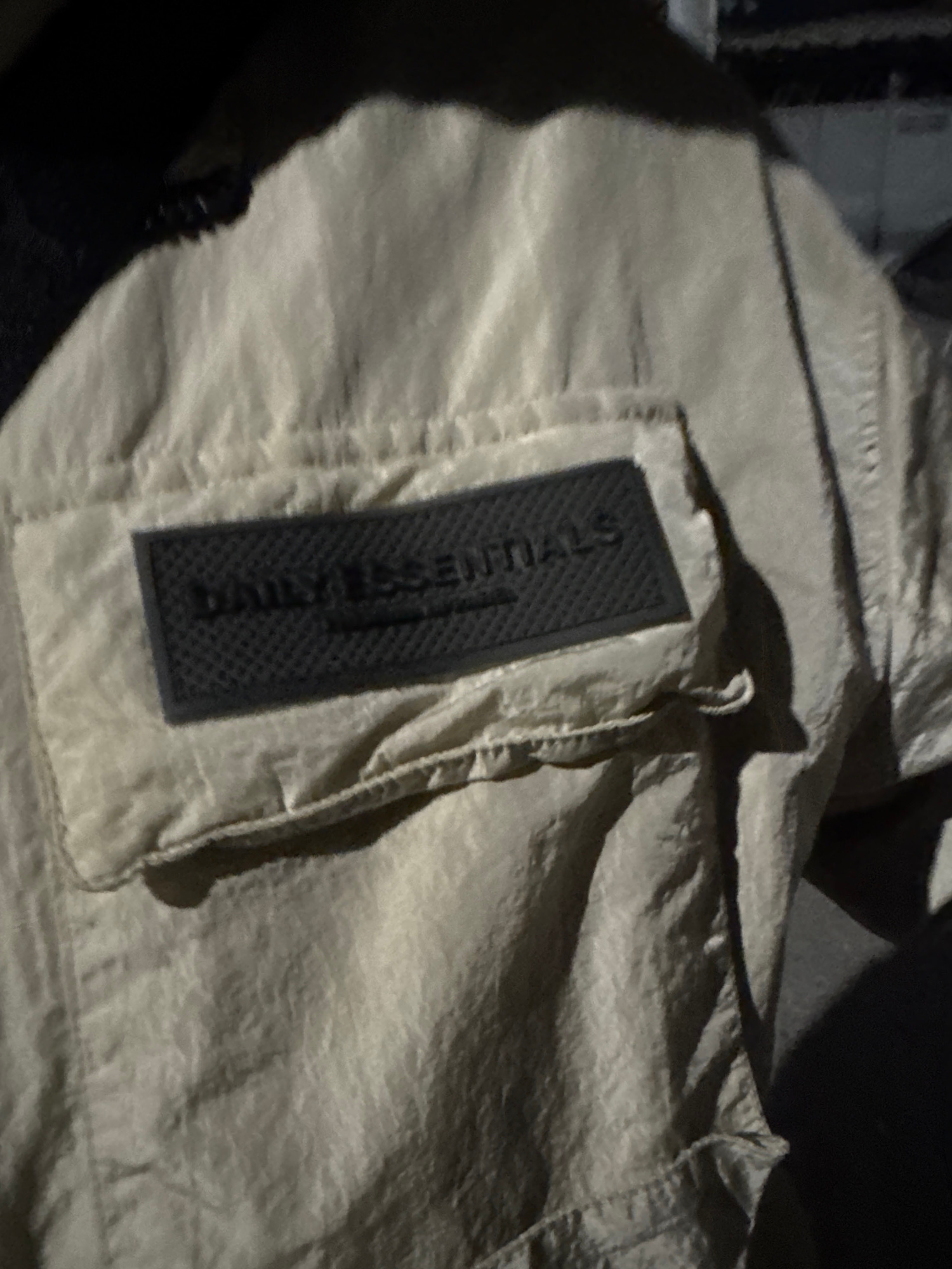 The image shows a close-up of a beige fabric garment, possibly a jacket, with a dark rectangular patch bearing the word "ESSENTIALS" in capital letters. The fabric has a crinkled texture. The backgrou…read more