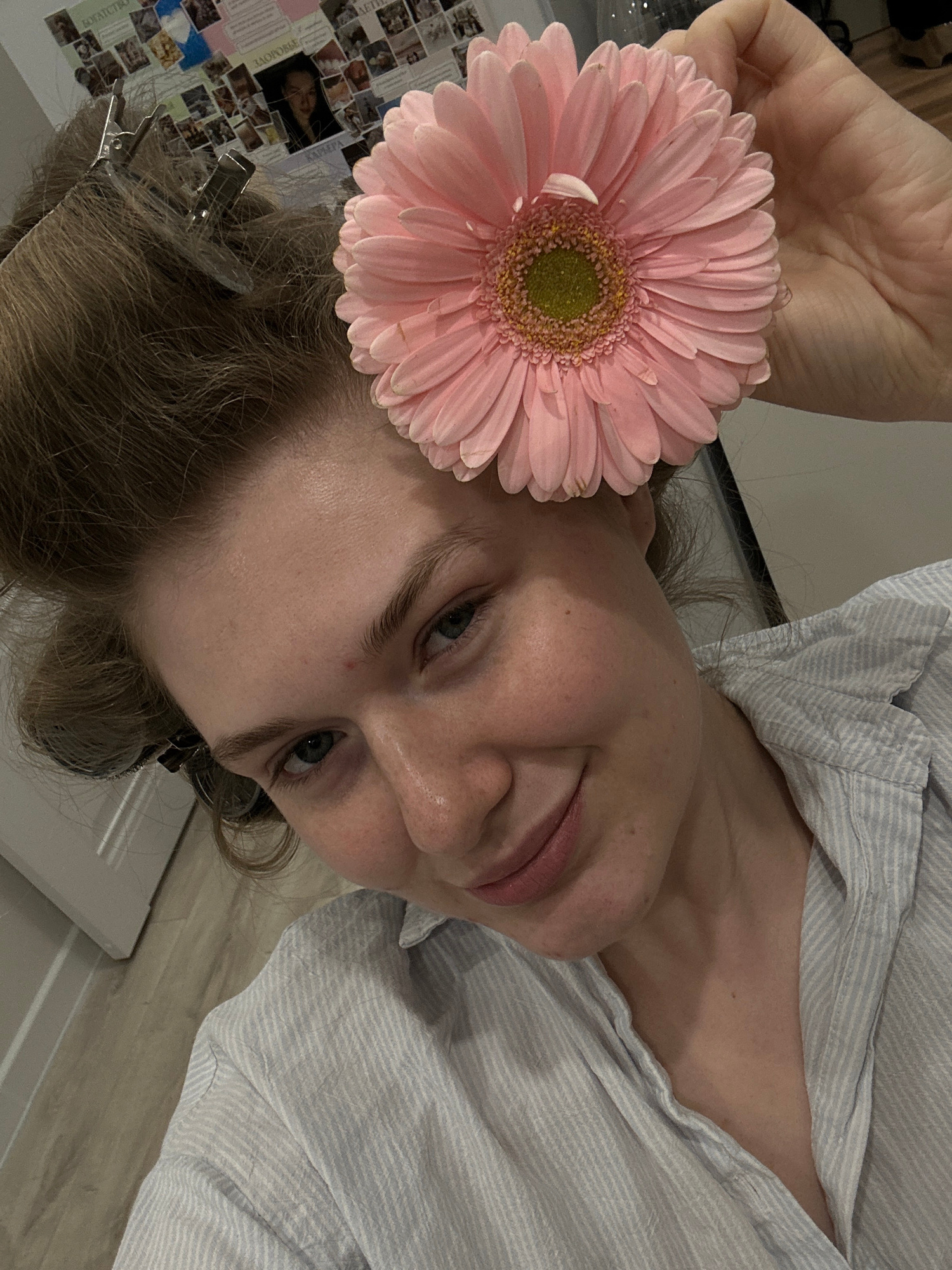 A woman is holding a pink gerbera daisy flower close to her head. She is wearing a light blue and white striped shirt. Her hair is brown and has clips in it. The background shows a wall with photograp…read more