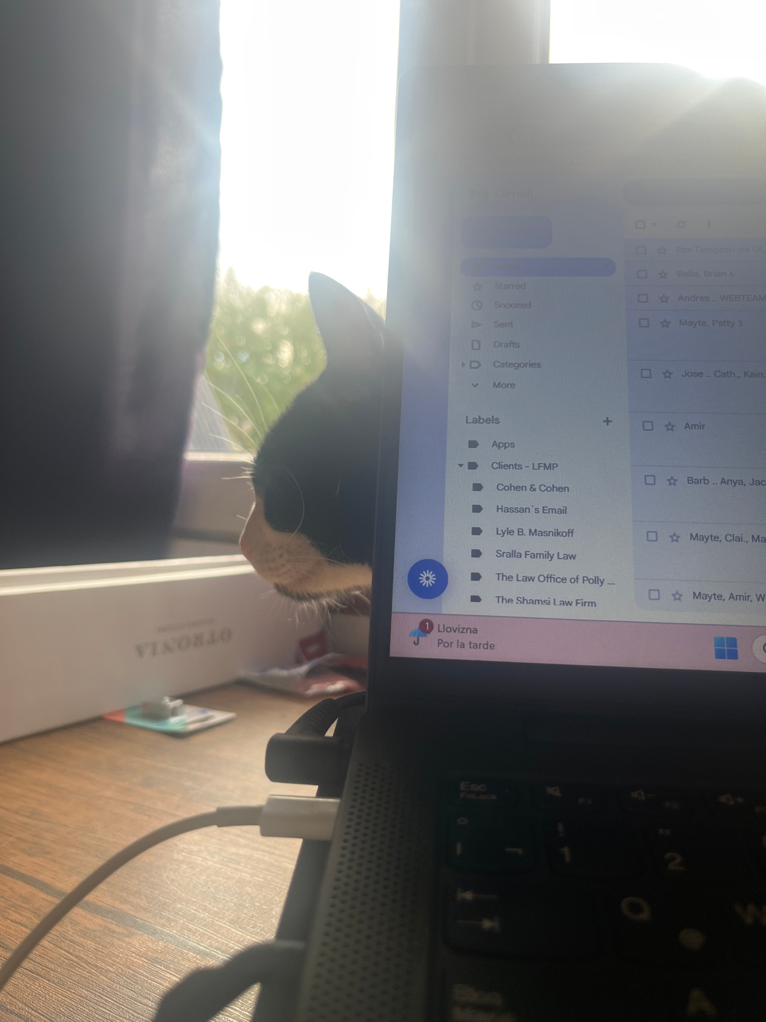 The image depicts a partial view of a laptop screen with a cat peering over the top edge. The screen displays what appears to be a Gmail inbox, with various labels and email subjects visible. The cat…read more