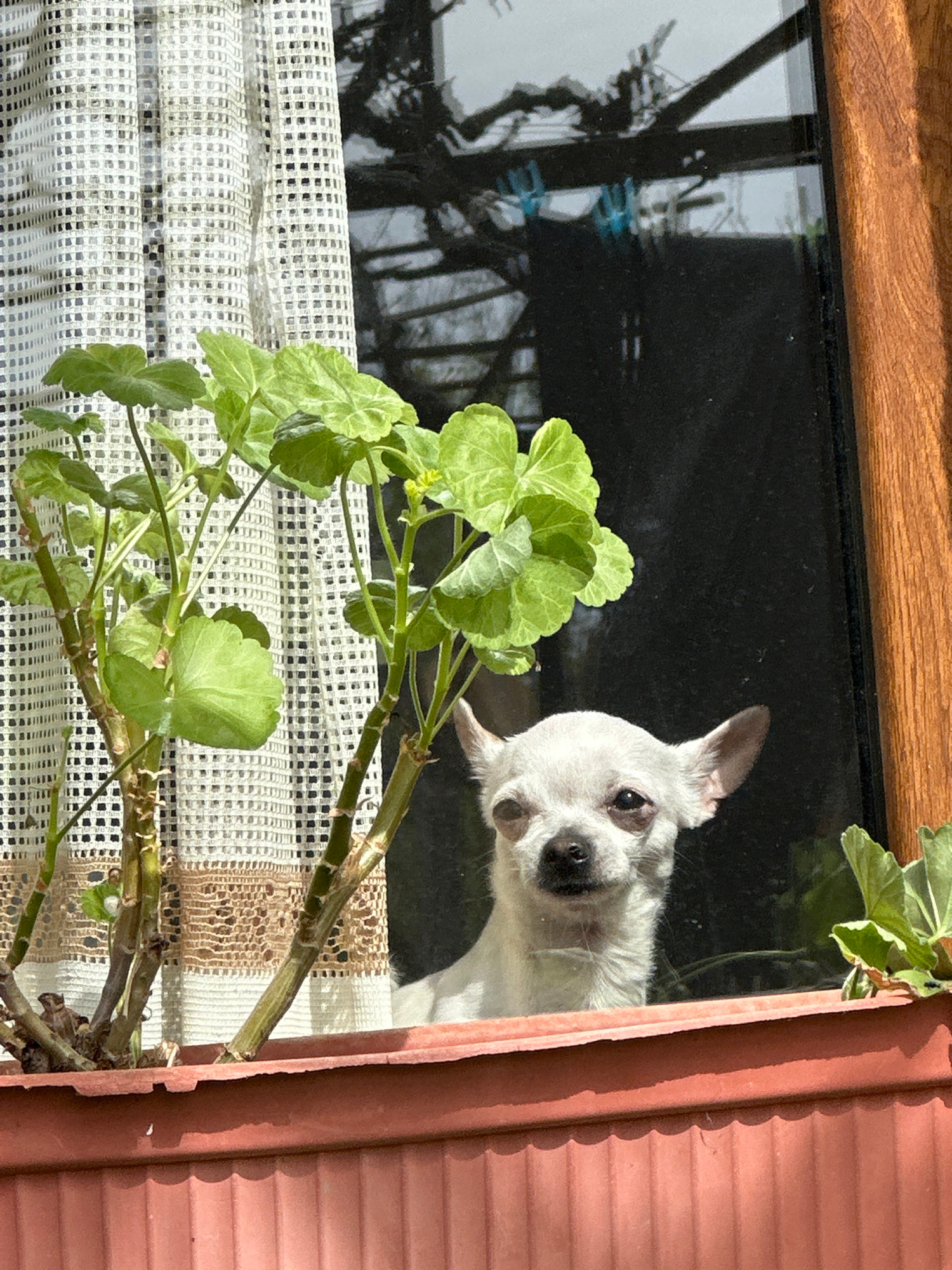 A small, white, fluffy dog, possibly a Chihuahua, is peeking out of a window in Chubra, Bulgaria. The dog's head is tilted, and it looks directly at the viewer with curious, dark eyes and a black nose…read more
