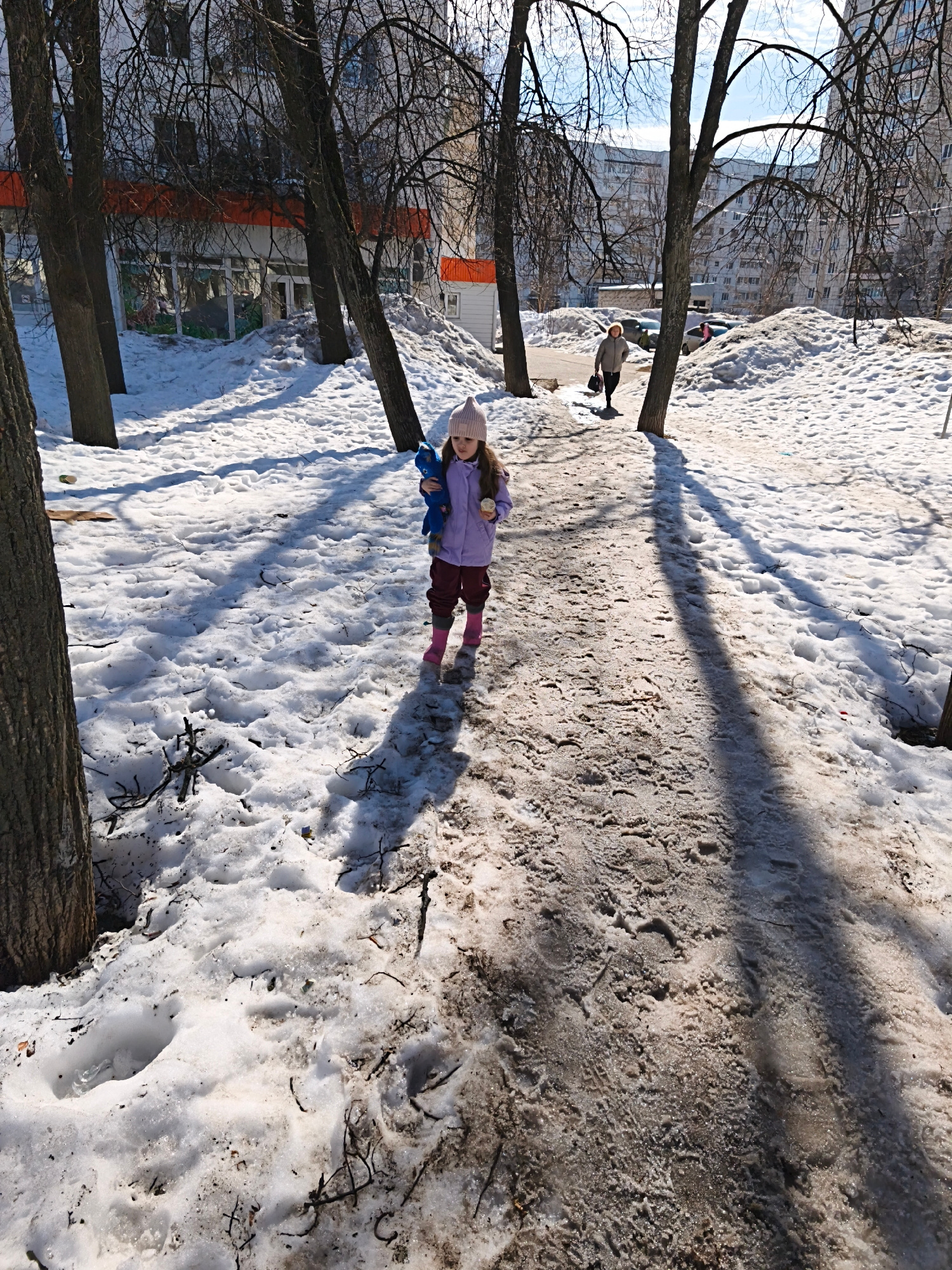The image depicts an outdoor urban scene in Chaikovsky, Russia, characterized by melting snow and bare deciduous trees under bright daylight. A young child, dressed in a light purple jacket, dark pant…read more