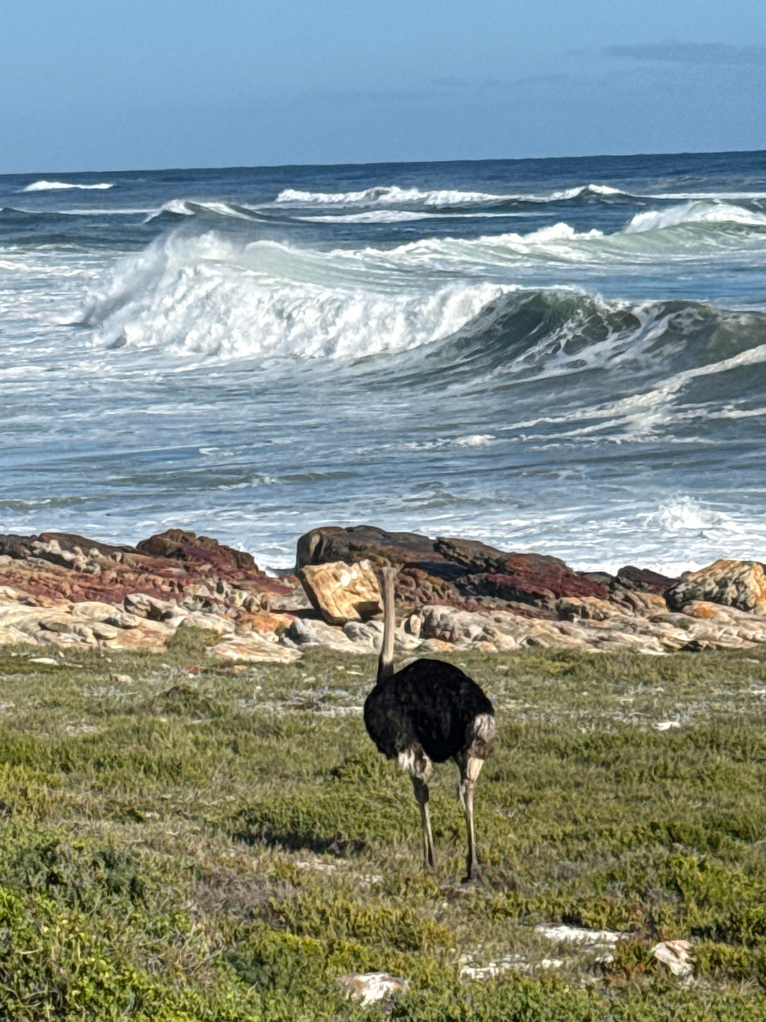The image displays a coastal landscape featuring an ostrich on a rocky, vegetated bank overlooking the ocean. In the midground, a dark-feathered ostrich stands prominently on a patch of green, low-ly…read more