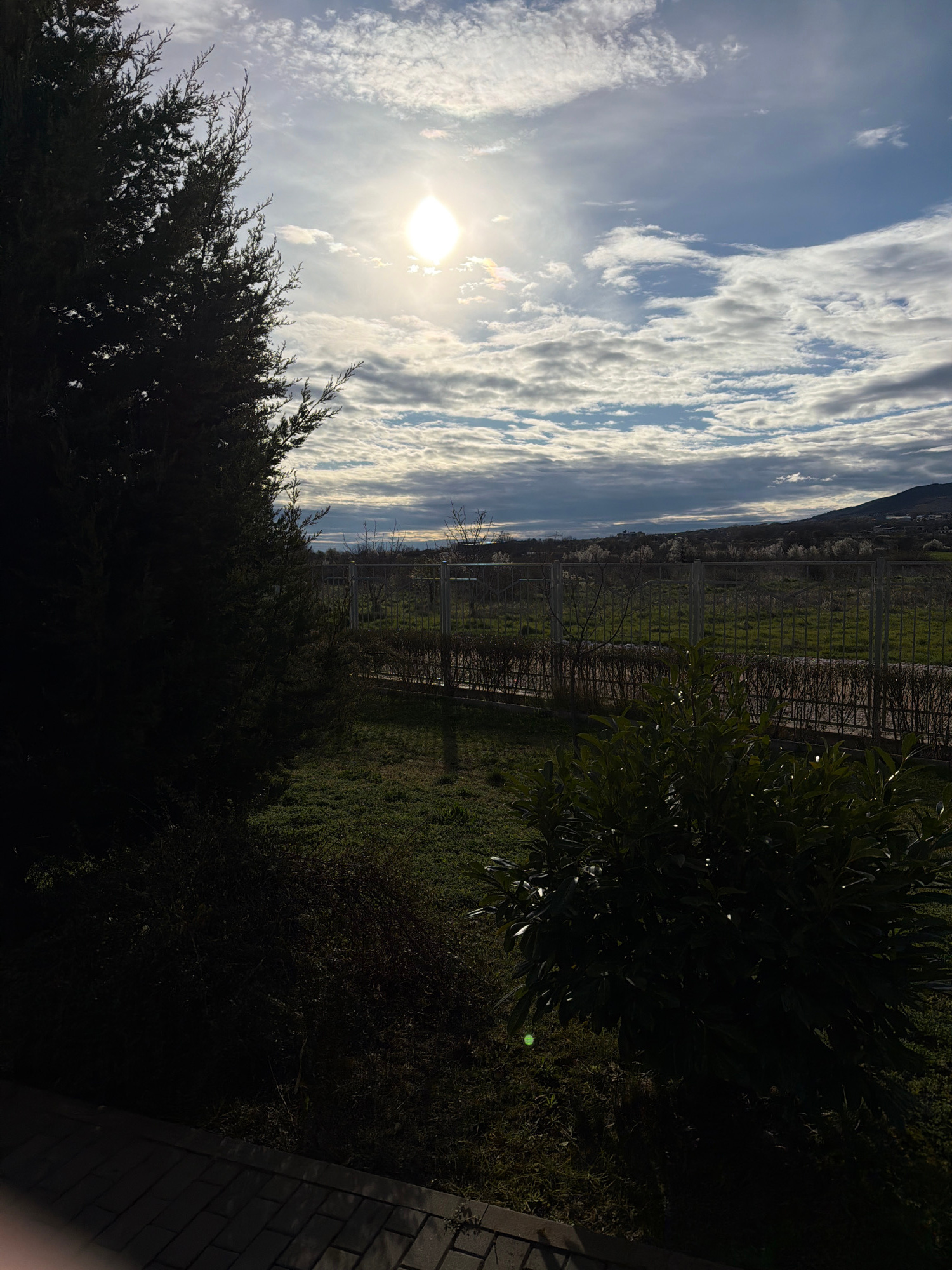 The image depicts a view in Markovo, Bulgaria, looking across a field towards the sky. A wire fence runs across the center of the frame, separating the foreground from the background field. The fieldโฆread more