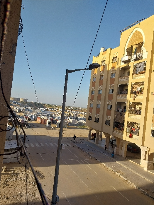 An elevated view captures a street scene in Khan Yunis, Palestinian Territory, under a clear blue sky. In the immediate foreground on the left, a portion of a light-colored building structure with att…read more
