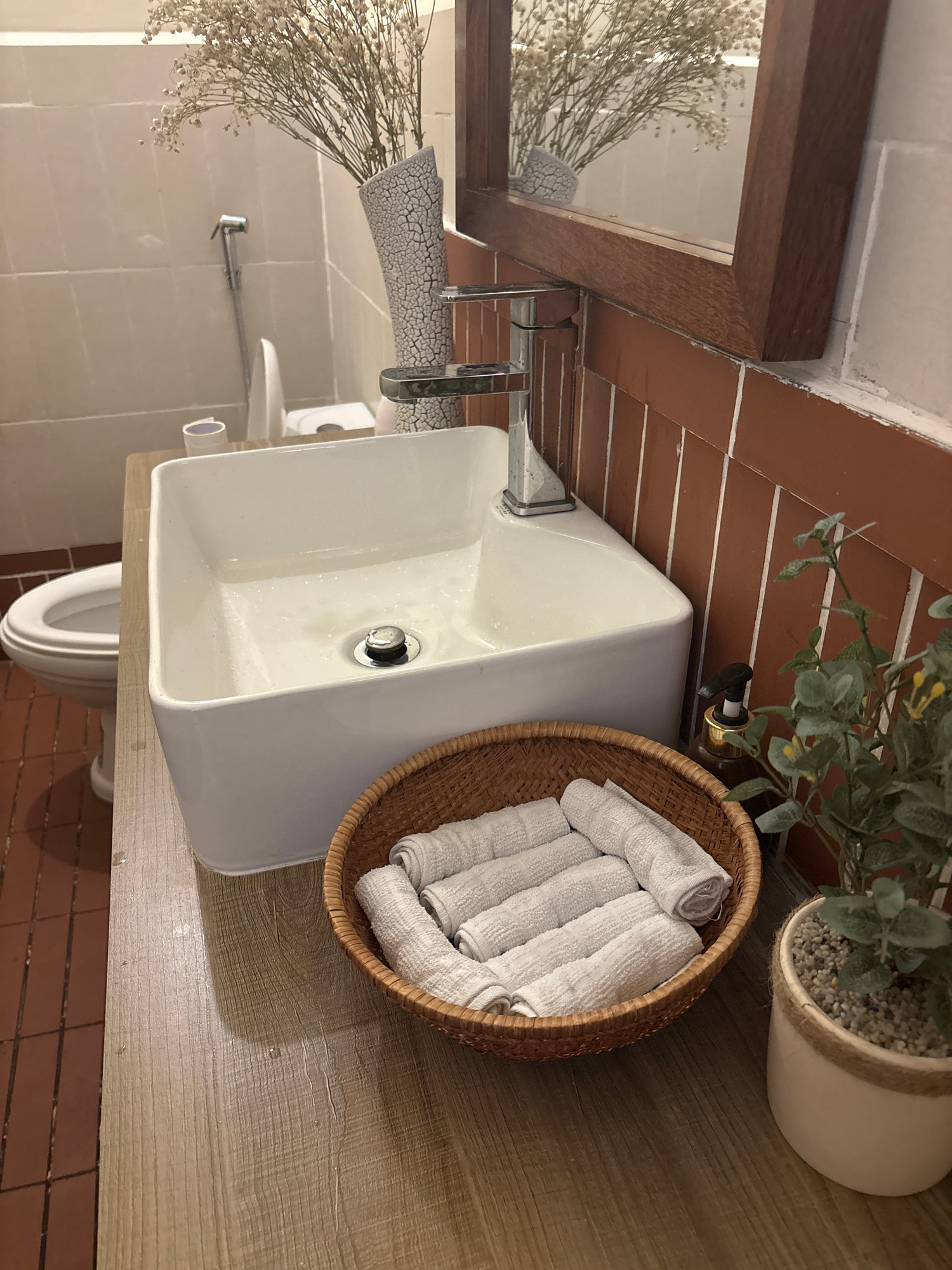 The image presents an eye-level, close-up view of a bathroom sink and countertop setup. The sink is a modern, rectangular white basin with a chrome faucet and drain. Beside the sink sits a round, wove…read more