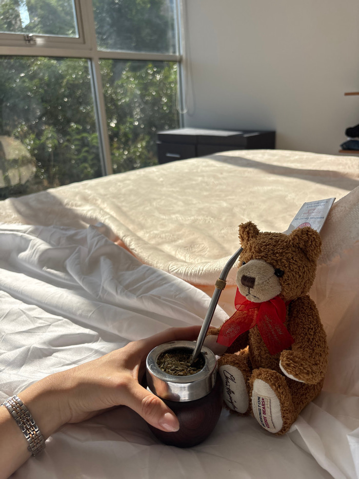 A brown teddy bear with a red ribbon rests on a white sheet, next to a mate gourd with a metal straw (bombilla) being held by a hand. A silver and gold bracelet adorns the wrist. Sunlight filters thro…read more