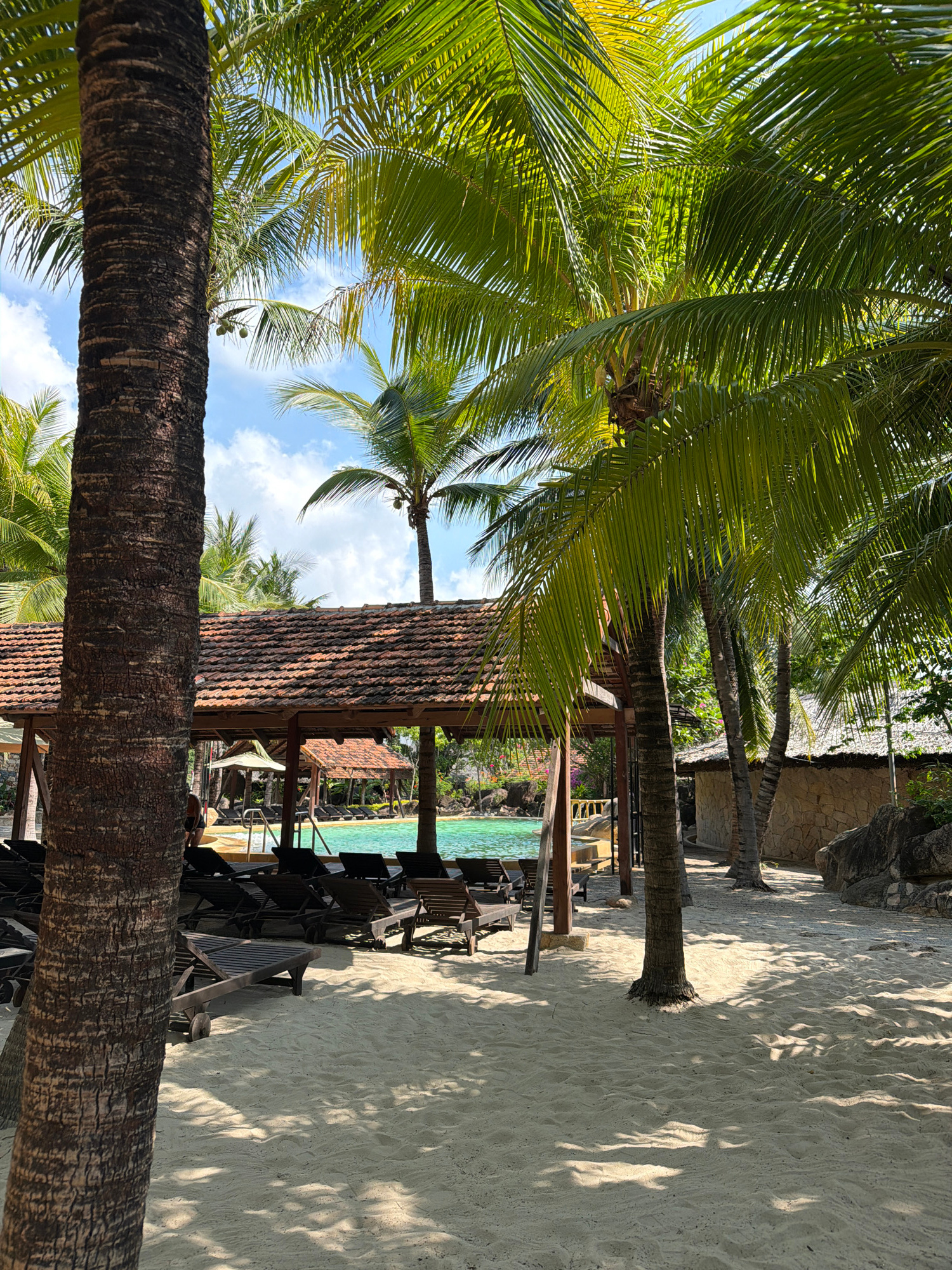 The image shows a beach scene at a resort in Tây Nha Trang, Vietnam. Tall coconut palm trees frame the view. The foreground features a close-up of a textured palm tree trunk, while other palms line th…read more