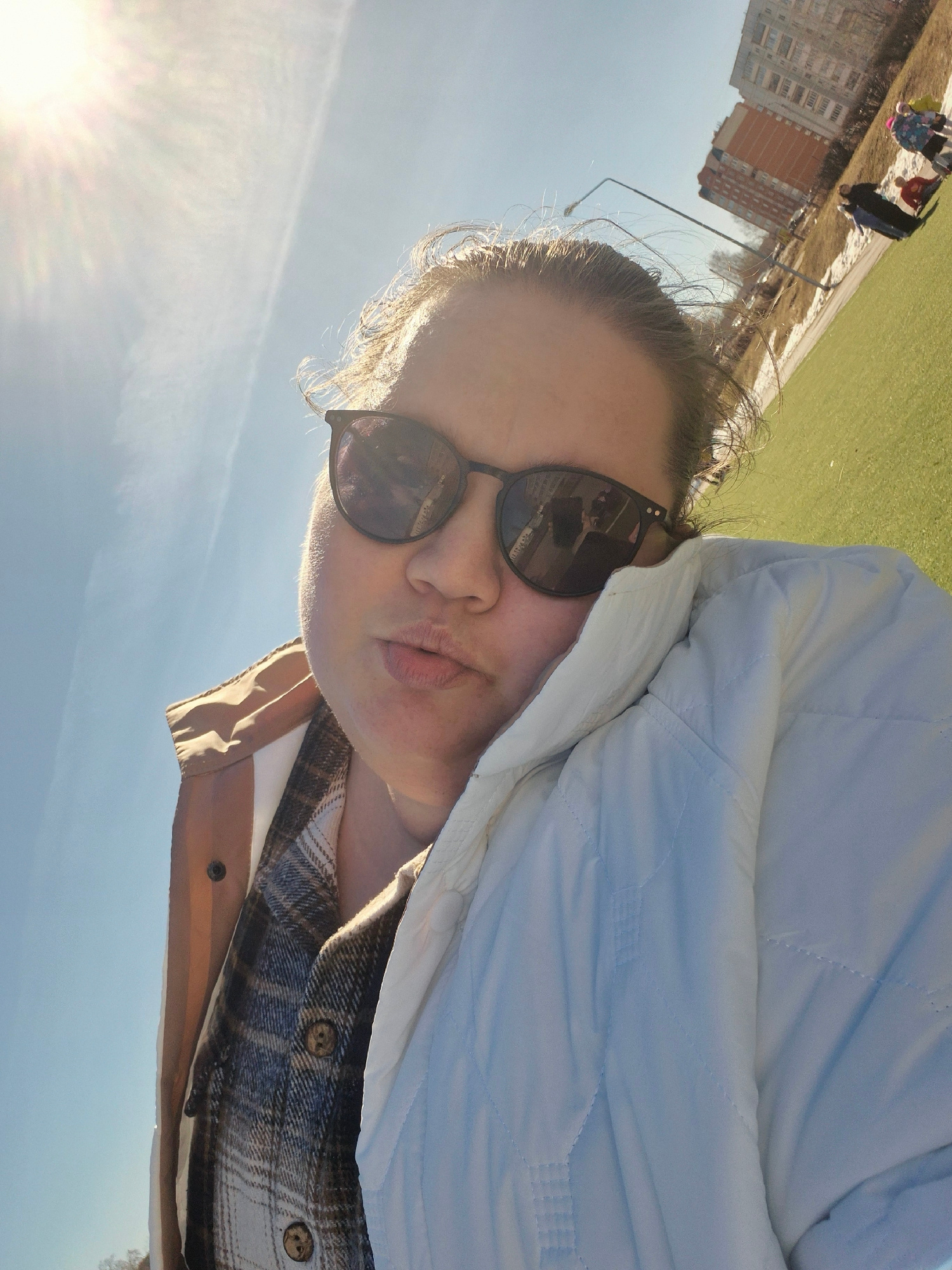 A woman wearing sunglasses and a white jacket is taking a selfie outdoors on a sunny day. She is also wearing a plaid shirt. The background shows a cityscape with apartment buildings, a grassy field,…read more
