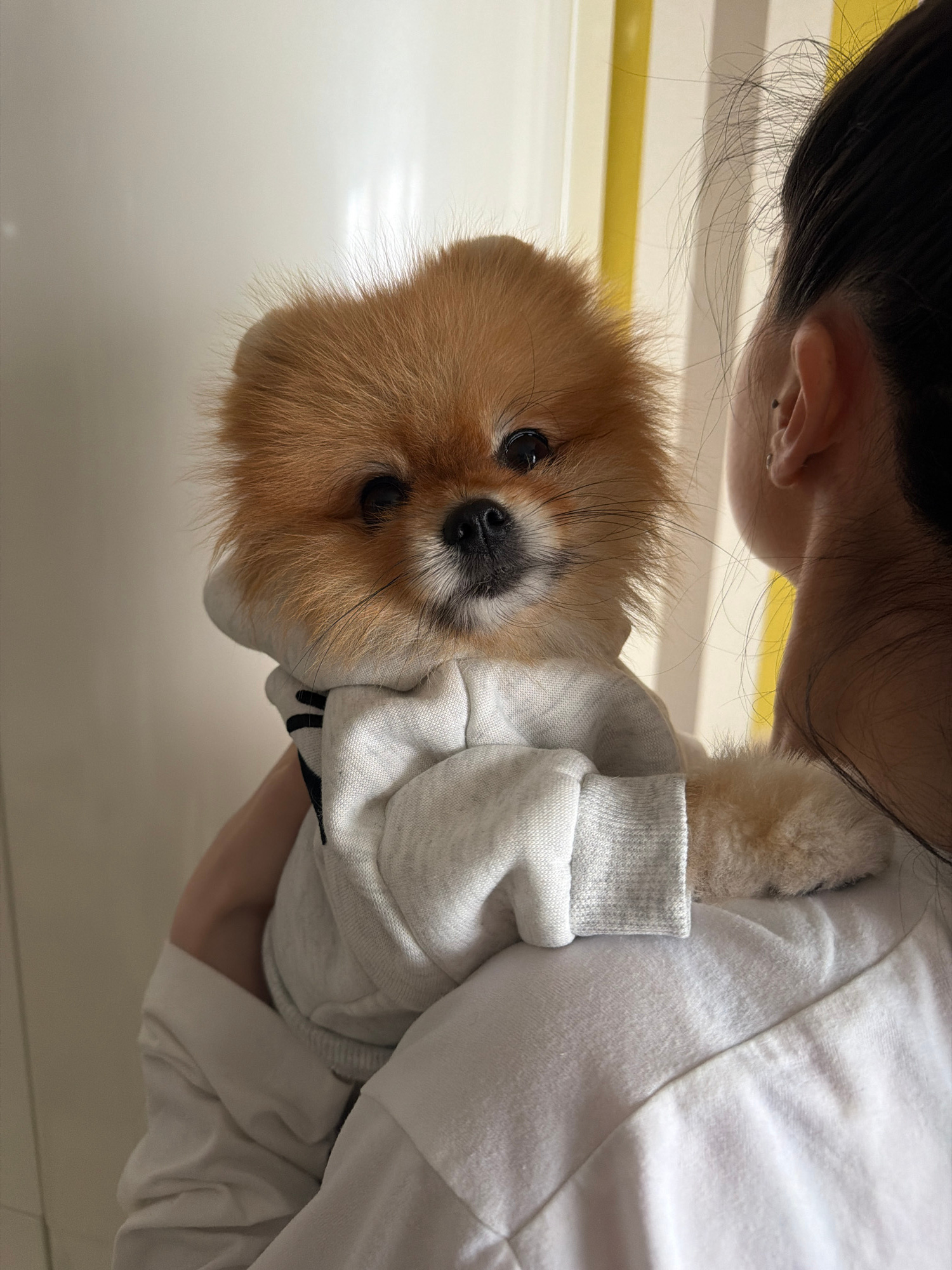 A medium shot depicts a fluffy, tan Pomeranian dog being held up to a woman's shoulder. The dog is wearing a light grey hooded sweatshirt, and its dark eyes are directed towards the camera. The woman'…read more
