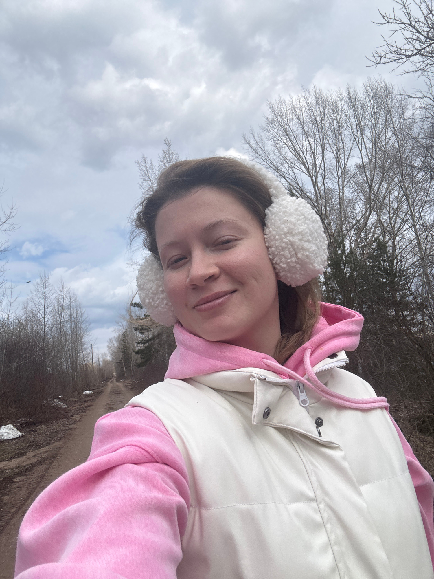 A young woman is captured in a selfie-style portrait taken outdoors, with the image rotated 90 degrees counter-clockwise. She is positioned towards the center-left of the frame, looking directly at thβ¦read more