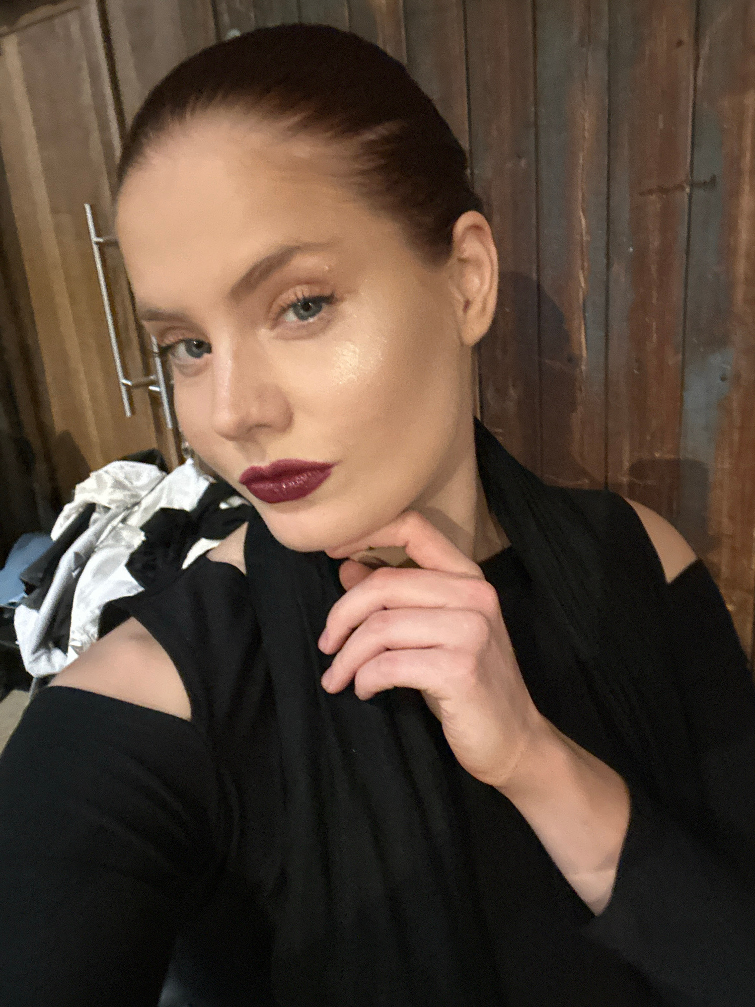 A woman with fair skin, dark hair pulled back, and dark red lipstick is looking at the camera. She is wearing a black top with the left shoulder bare. Her right hand is touching her neck. The backgrou…read more