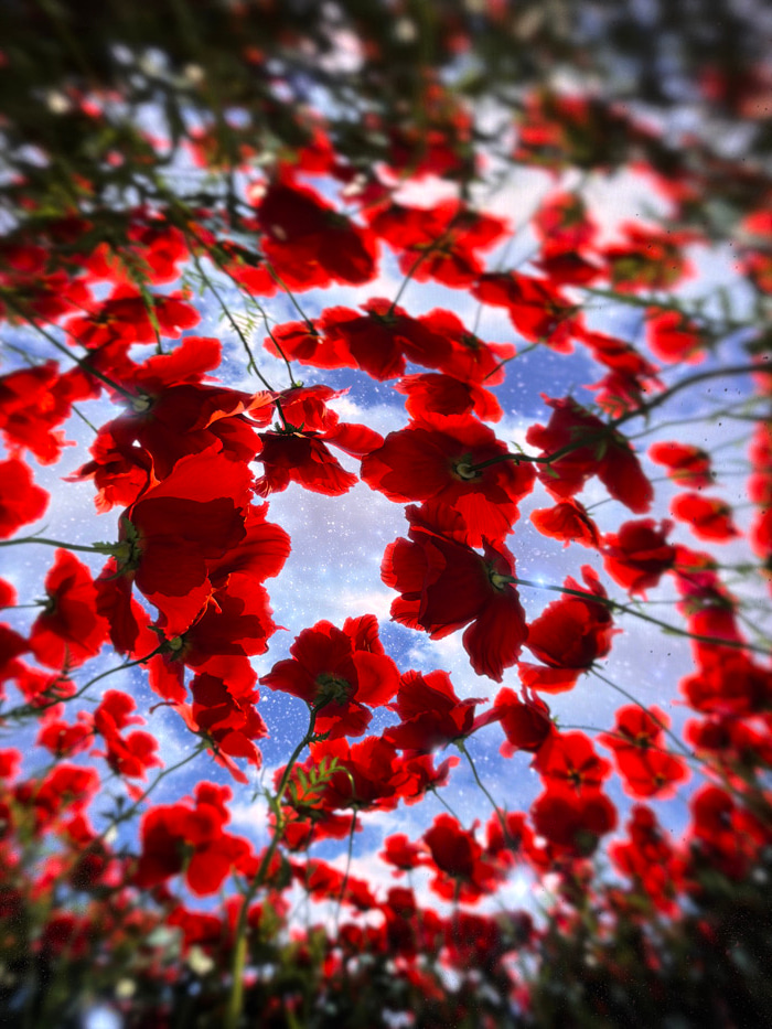 A low-angle shot captures a field of vibrant red poppies under a partly cloudy sky. The flowers, densely packed and facing downward, frame the blue sky with white clouds at the center. The image creatβ¦read more